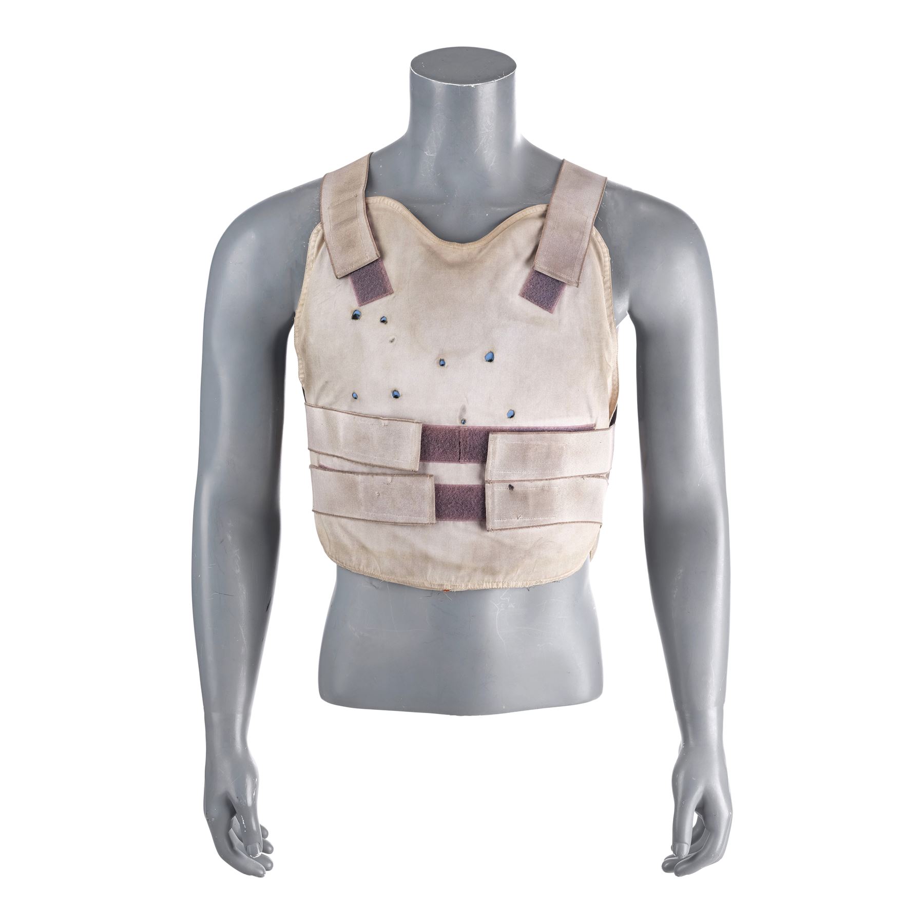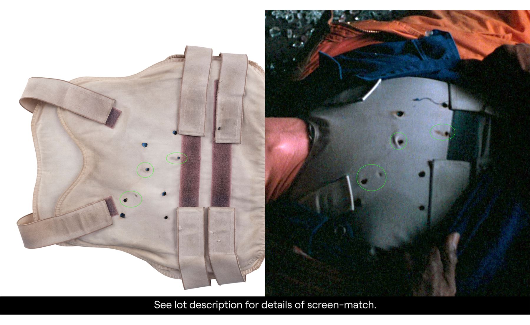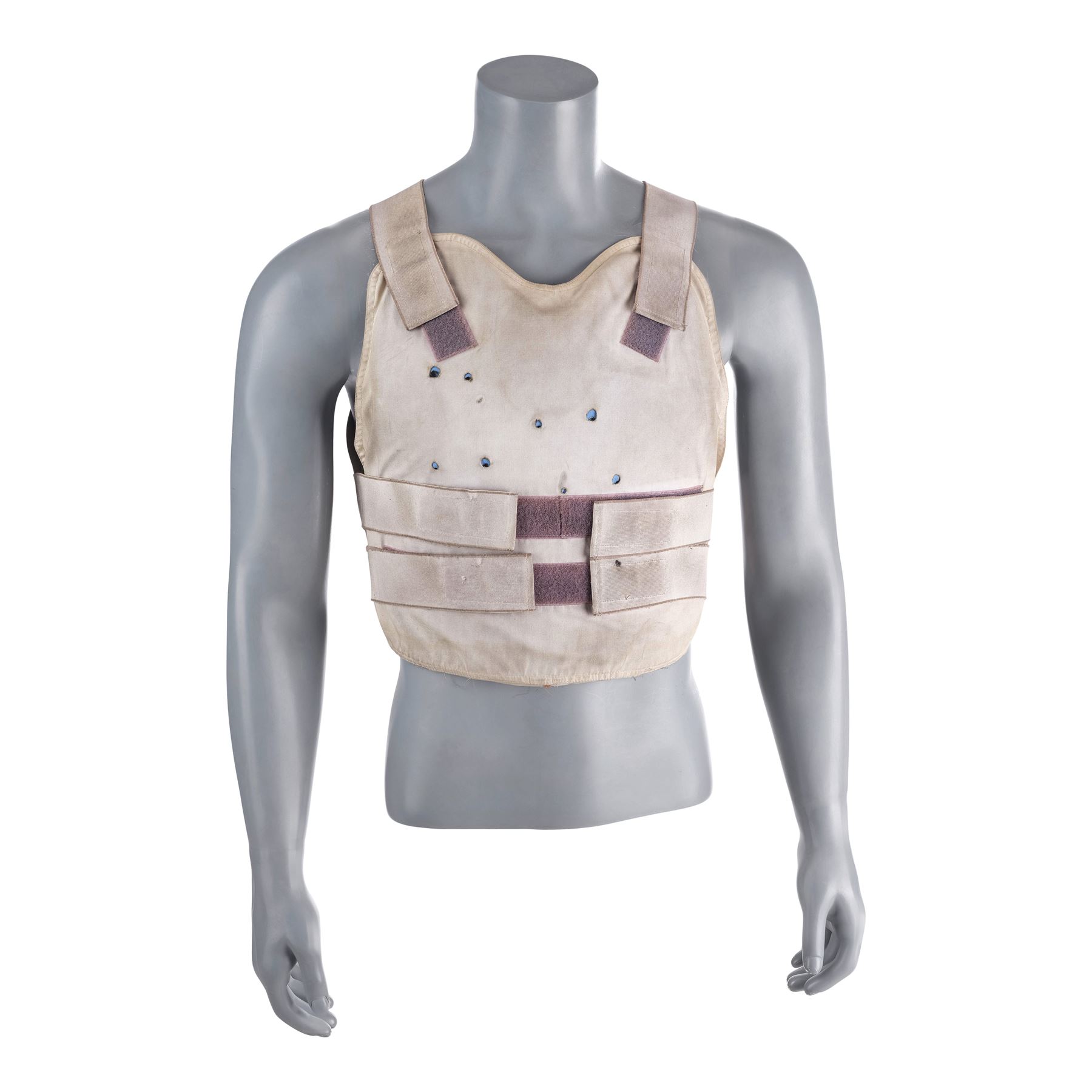 LETHAL WEAPON (1987) - Martin Riggs' (Mel Gibson) Screen-Matched Bulletproof Vest - Martin Riggs' (Mel Gibson) screen-matched bulletproof vest from Richard Donner's Lethal Weapon. Riggs wore his vest under his clothing when he was suddenly shot in a drive-by by Mr. Joshua (Gary Busey) with a Remington 870 with an extended magazine tube. This vest screen-matches to when Roger Murtaugh (Danny Glover) checked Riggs for a pulse and discovered he was wearing his bulletproof vest as a precaution. The vest screen-matches to the identifiable positions of the bullet holes, as well as the smudge marks near the lowest bottom hole and the curved smudge across the chest.