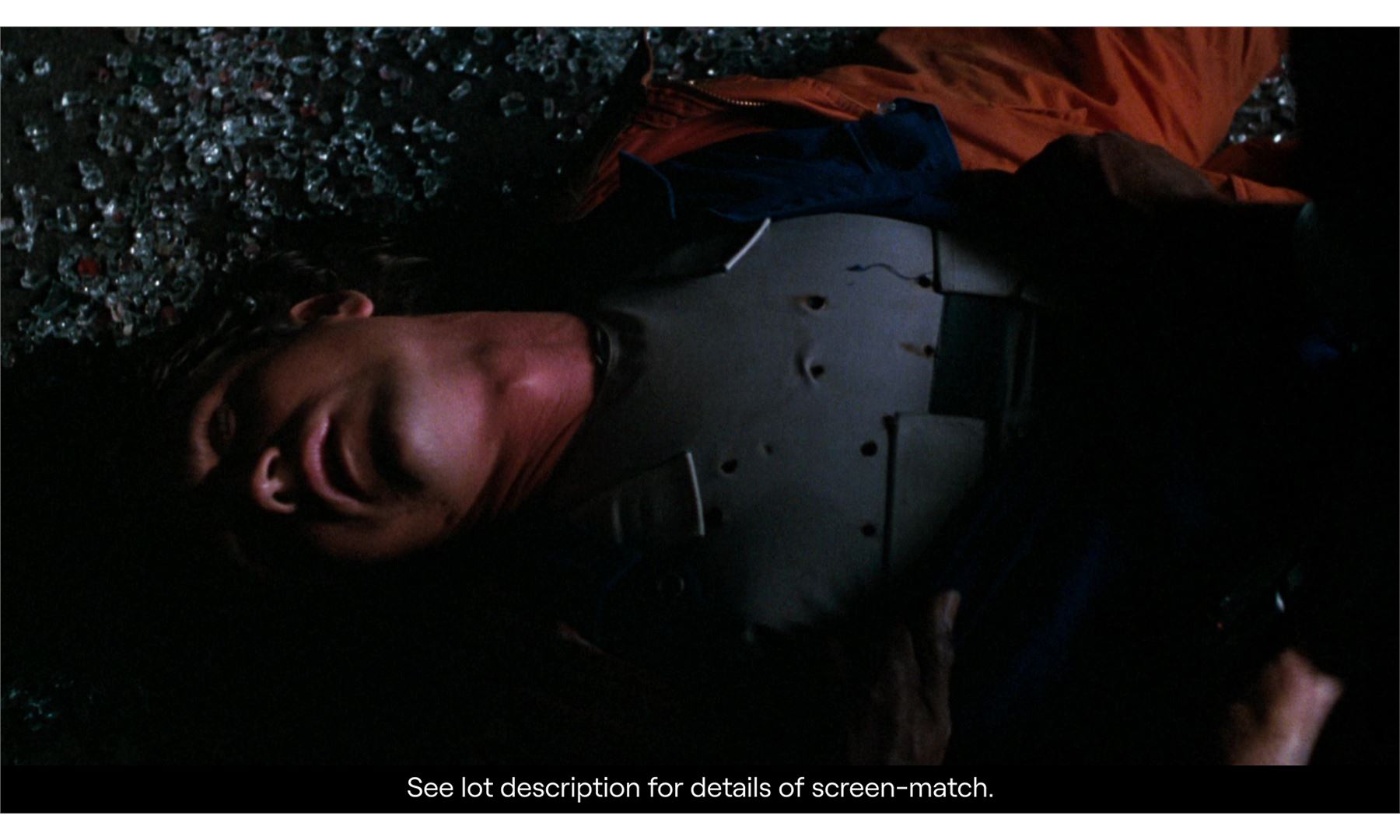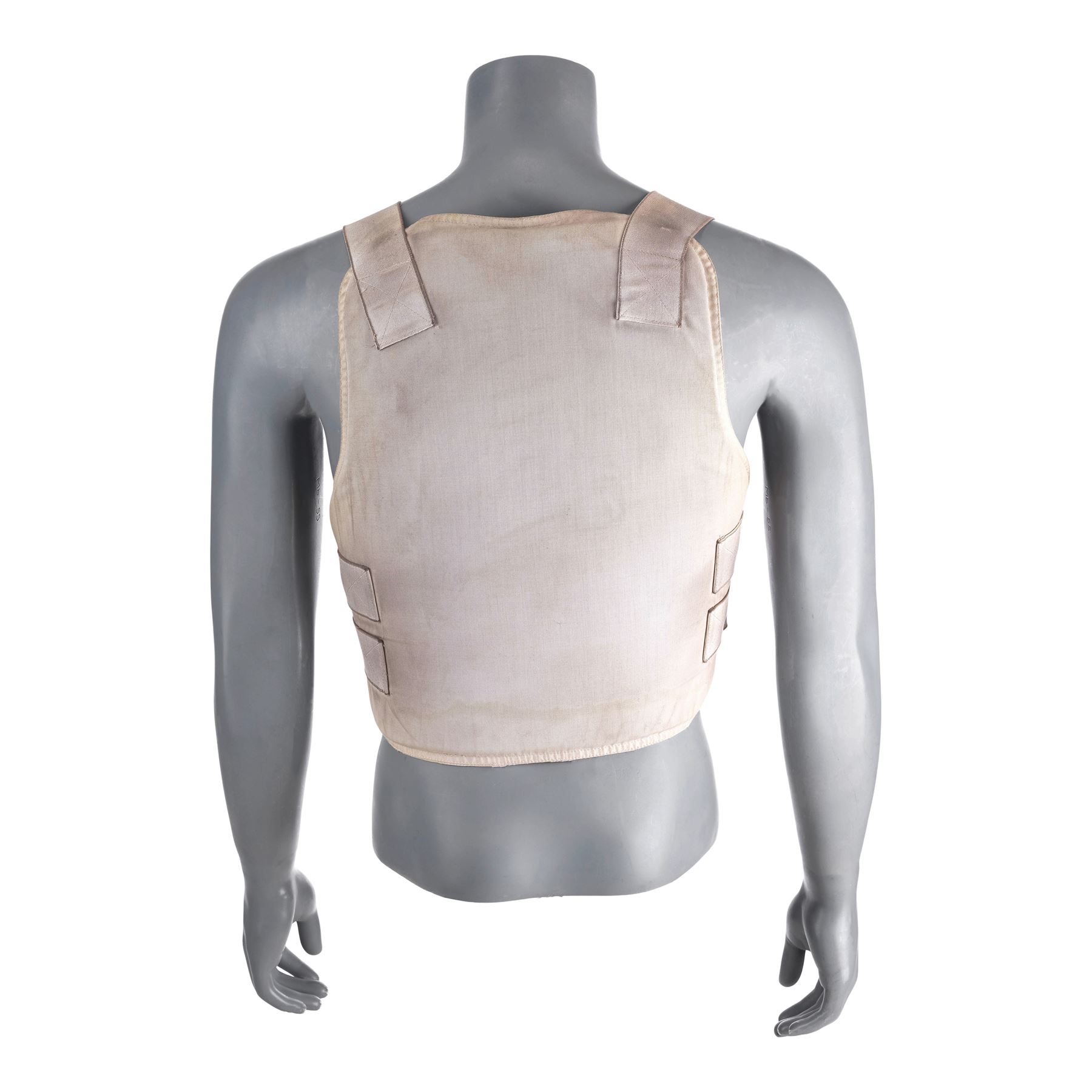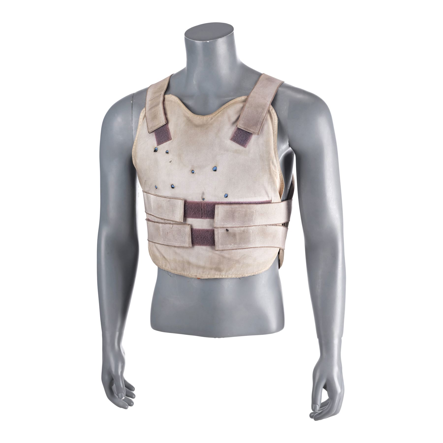 LETHAL WEAPON (1987) - Martin Riggs' (Mel Gibson) Screen-Matched Bulletproof Vest - Martin Riggs' (Mel Gibson) screen-matched bulletproof vest from Richard Donner's Lethal Weapon. Riggs wore his vest under his clothing when he was suddenly shot in a drive-by by Mr. Joshua (Gary Busey) with a Remington 870 with an extended magazine tube. This vest screen-matches to when Roger Murtaugh (Danny Glover) checked Riggs for a pulse and discovered he was wearing his bulletproof vest as a precaution. The vest screen-matches to the identifiable positions of the bullet holes, as well as the smudge marks near the lowest bottom hole and the curved smudge across the chest.