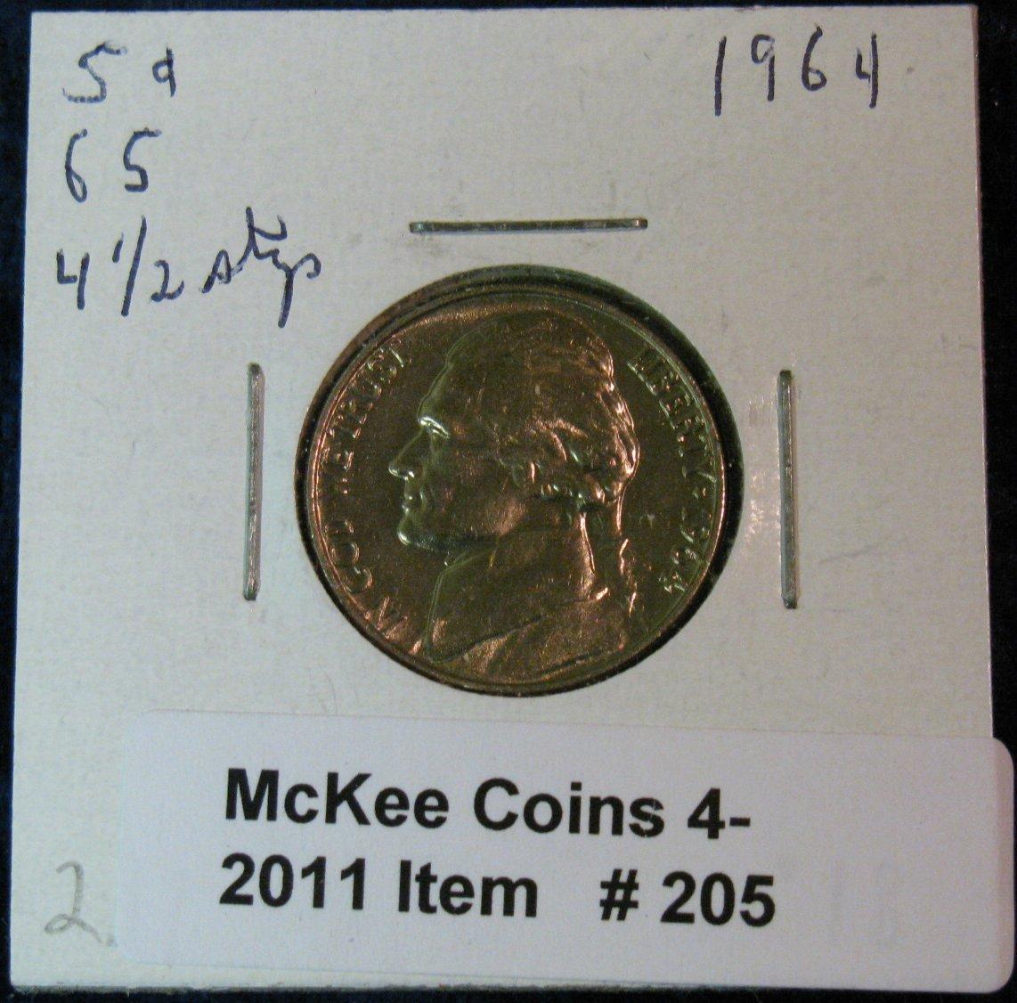 205. 1964 P Jefferson Nickel. MS 65. 4 1/2 steps.