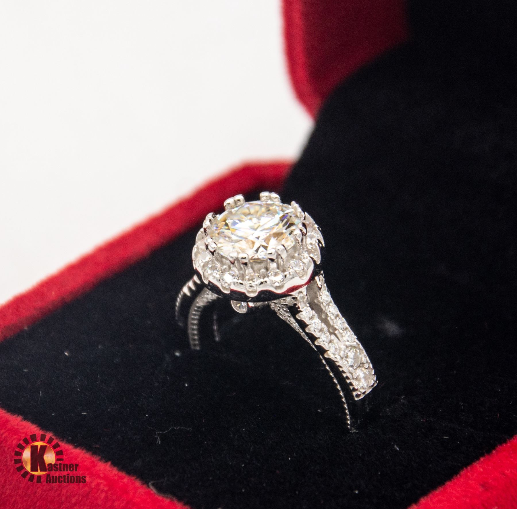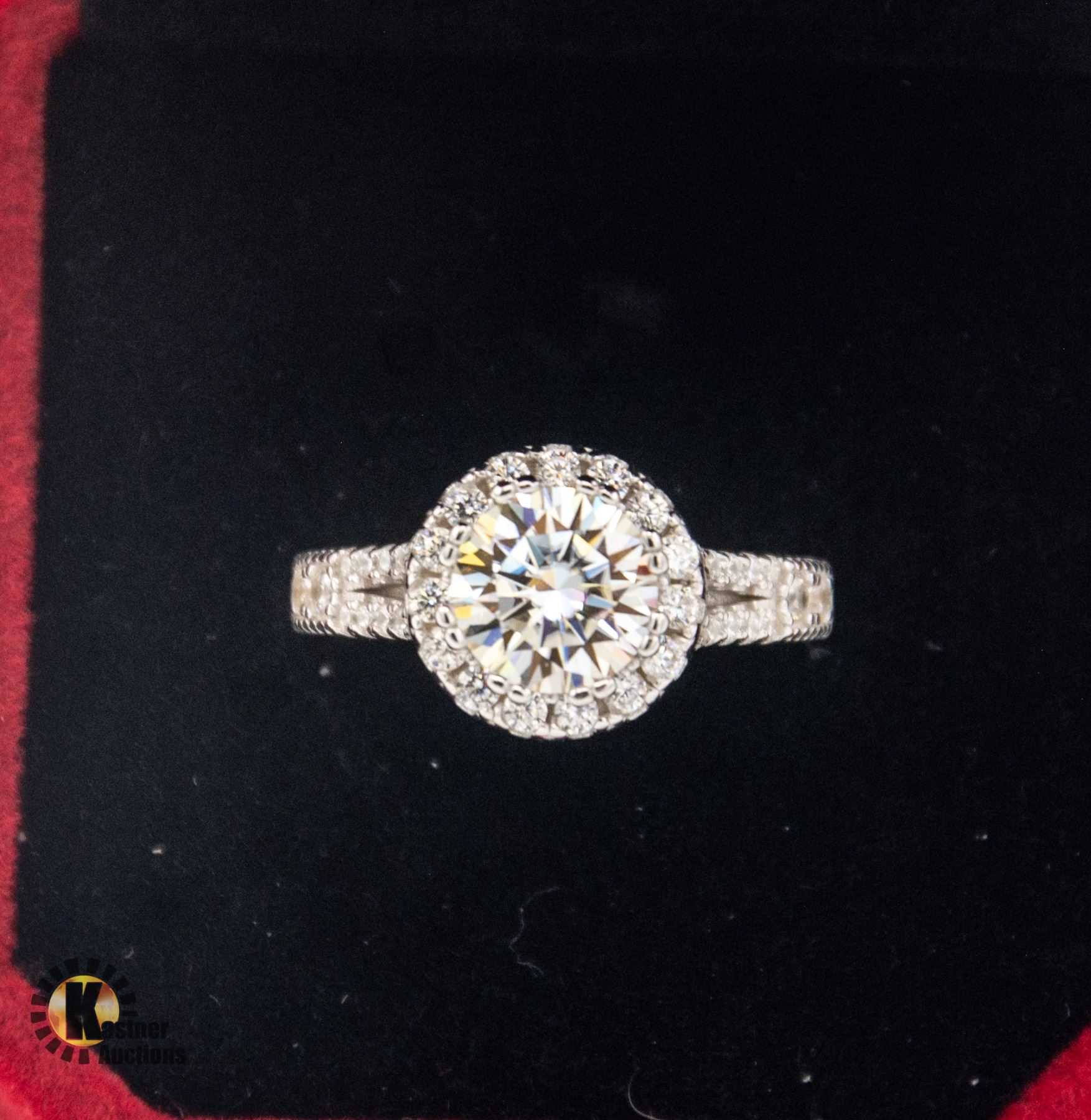 MOISSANITE STONE VVS D COLOR SET WITH 90 ROUND BRILLIANT CUT CUBIC ZIRCONIA SET IN HALO & SHANKS SET IN 925 SILVER RING SIZE 7 RETAIL VALUE $1,075.00 **ALL ITEMS MUST BE REMOVED BY 5PM SATURDAY, JANUARY 25TH 2025. ALL REMAINING ITEMS WILL BE SUBJECT TO A $6.00 PER DAY STORAGE CHARGE. ANY ITEMS REMAINING AFTER MONDAY, FEBRUARY 17TH 2025 WILL BE CONSIDERED FORFEITED. NO REFUNDS WILL BE ISSUED FOR FORFEITED ITEMS. TO SCHEDULE A PICK UP APPOINTMENT CLICK HERE