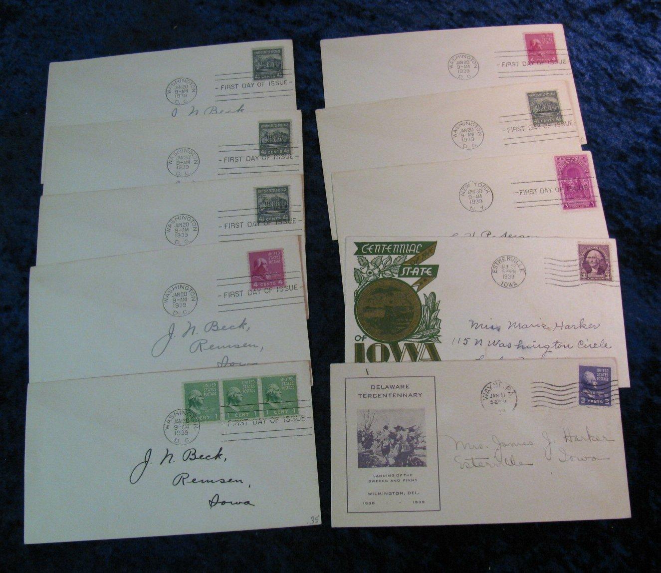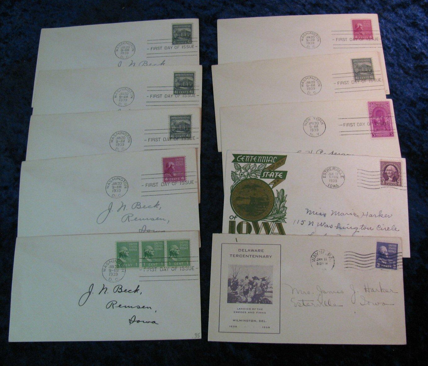 206. (10) 1939 Postmarked Covers including First Days; Iowa Centennial; & Delaware Tercentennary.