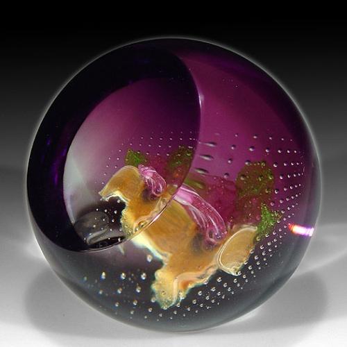 Caithness Glass "Dewdrop Orchid" paperweight, containing a mauve and goldenrod orchid, with light green leaves, on a layer of tiny spaced bubbles, over translucent lavender ground. Front window facet. Signed. Diameter 2 3/4". NO RESERVE