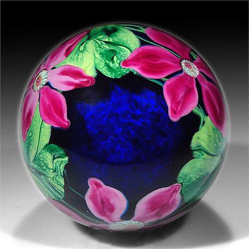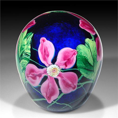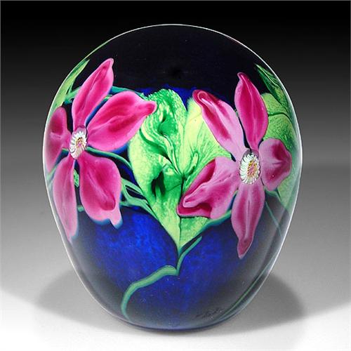 Peter Raos 1999 "Pink Paradise" high-domed pink flowers paperweight. Three spaced pink flowers and heart-shaped green leaves, encircle the dark blue sides of the piece. Signed/dated. Height 3 3/8", diameter 2 7/8". NO RESERVE