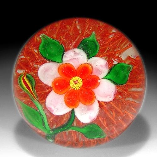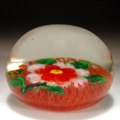Chinese flower on latticinio paperweight, containing a double-tiered flower, with a yellow and red cane center, which is encircled by a ring of six small reddish-orange petals and six larger white petals. The flower is crowned by three green leaves, and grows on a stem with a bud and two additional green leaves, over a cushion of reddish-orange latticinio. Diameter 2 5/8". Very minor surface wear. NO RESERVE
