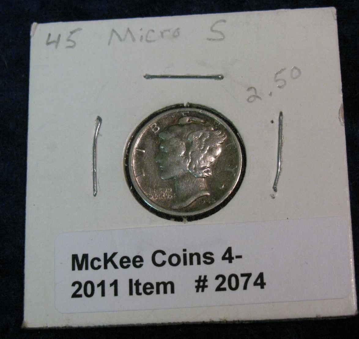2074. 1945 Micro S Mercury Dime. EF 40.