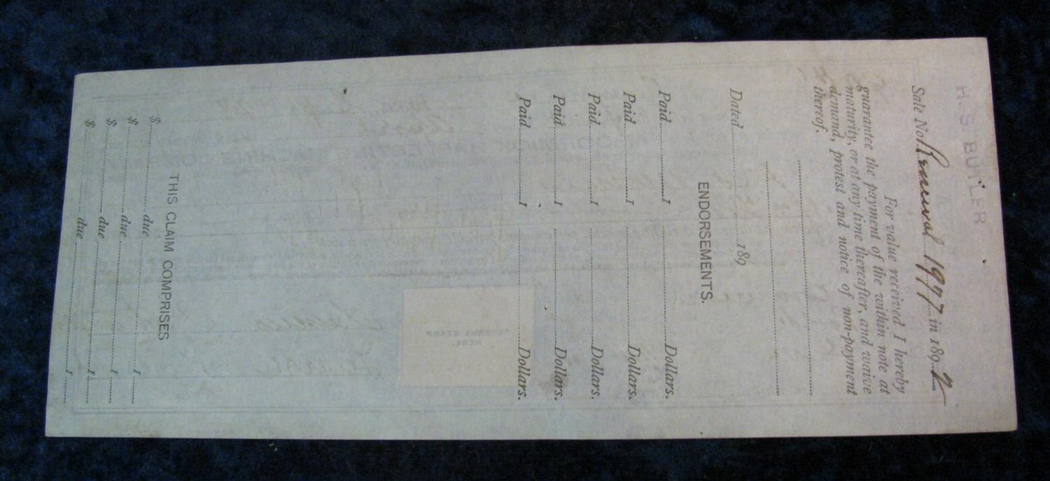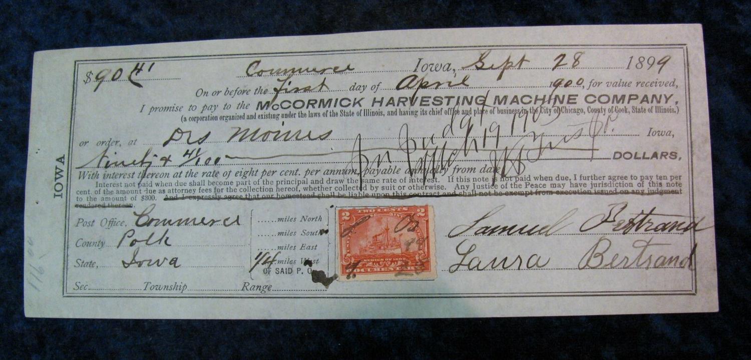 208. 1899 Promissory Note payable to the Mc Cormick Harvesting Machine Co. with 2c Documentary Stamp.
