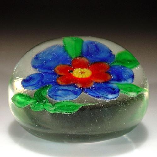 Chinese flower paperweight, containing a double-tiered flower, with a yellow and red cane center, encircled by a ring of six, small, reddish-orange petals and six, larger, blue petals, growing on a stem with green leaves, over clear ground. Diameter 2 3/8". Very minor surface wear. NO RESERVE