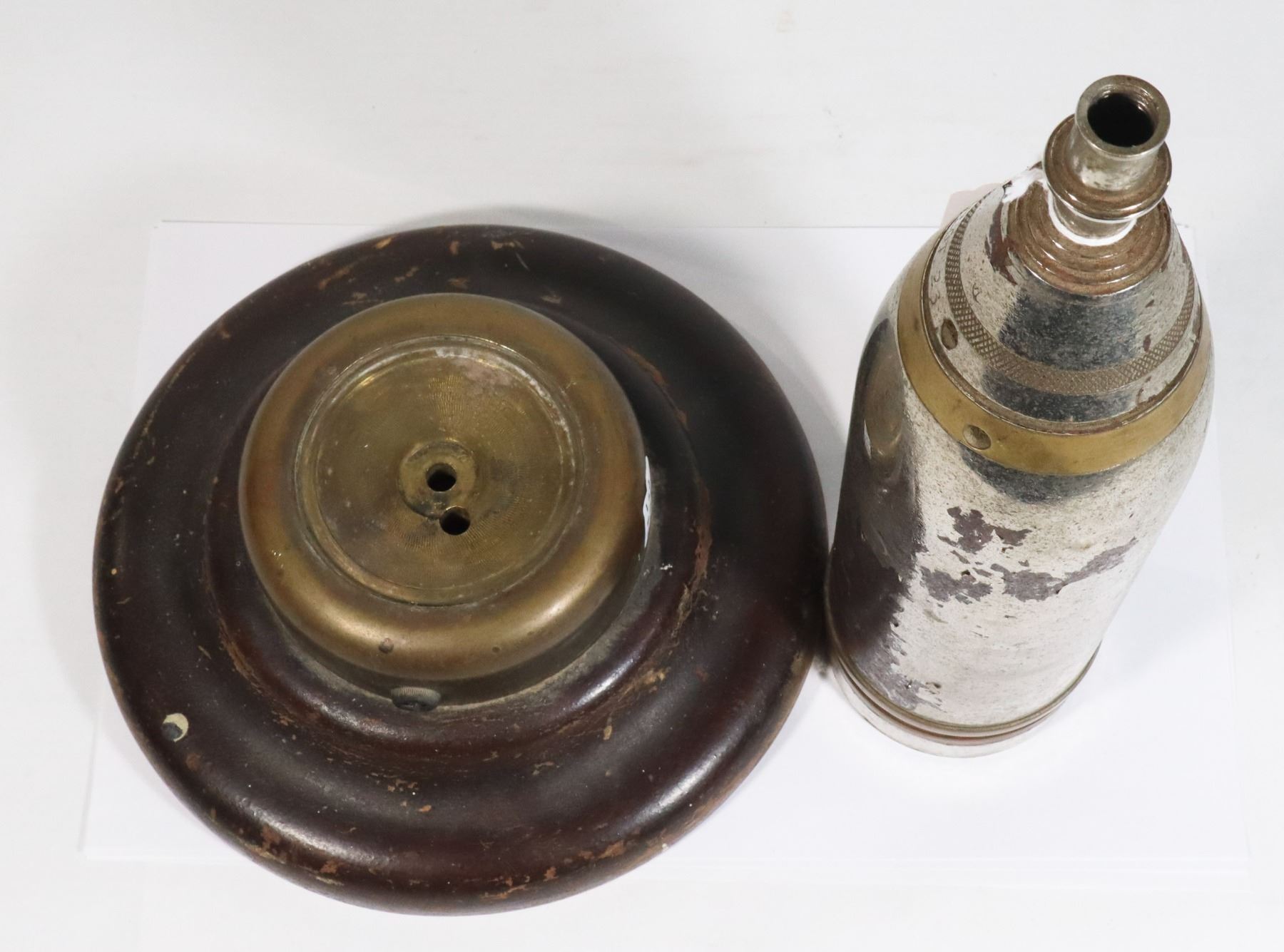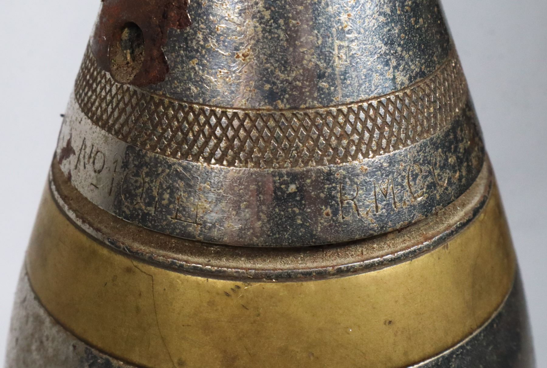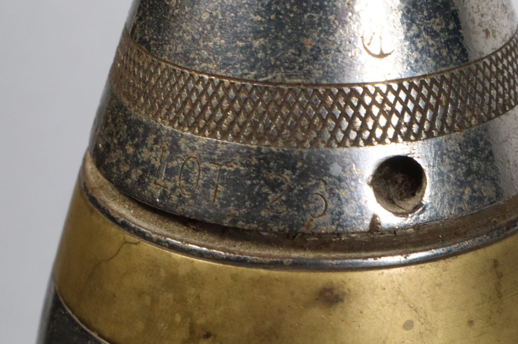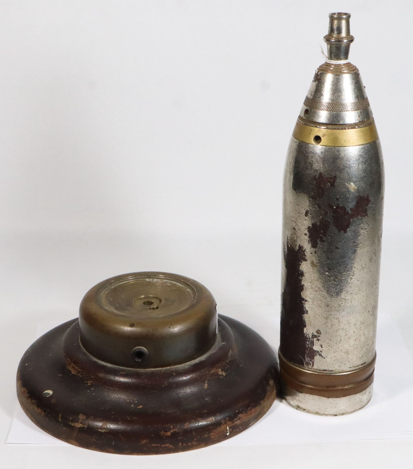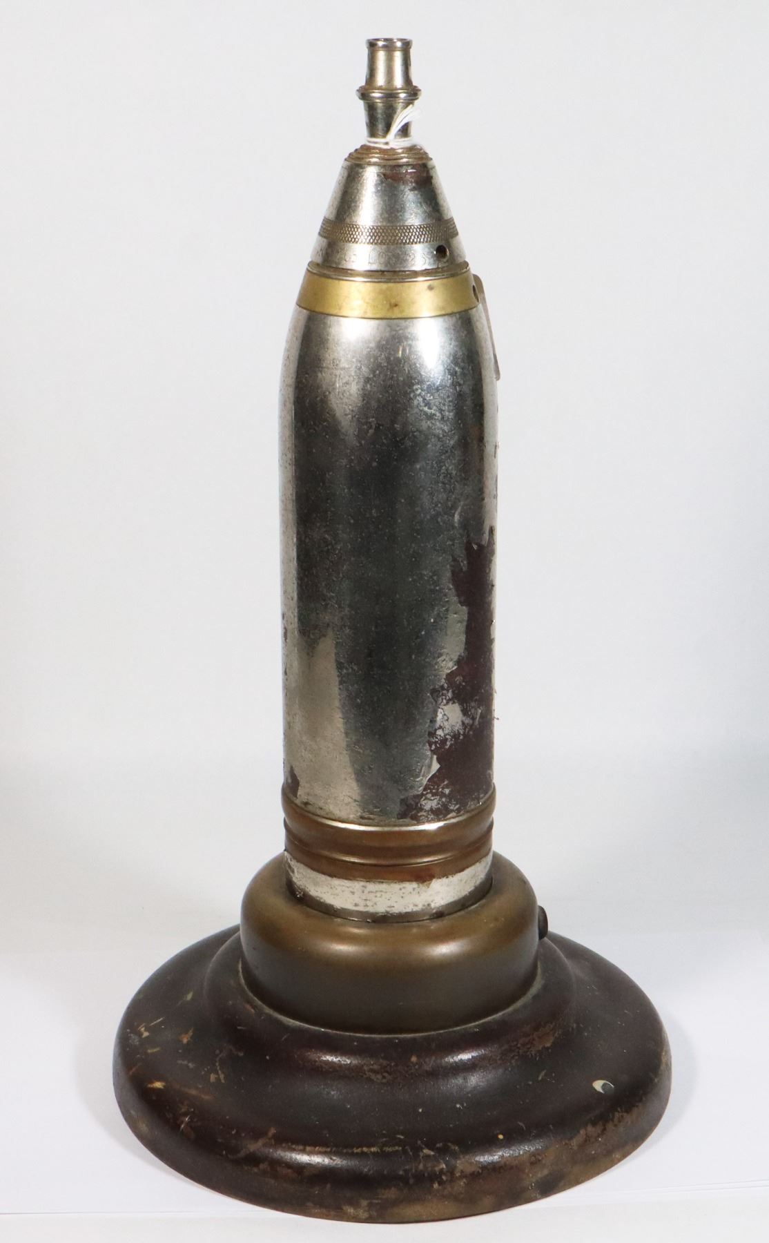 INERT NON WORKING CHROMED WITH CANADIAN MARKINGS ON REMOVABLE FUZE, MARKINGS ON LOWER SECTION OF SHELL, REMOVABLE OFF WOODEN BASE WORLD WAR ONE WORLD WAR TWO FUSE FUZE. CONVERTED TO LAMP, CAN BE SET UP FOR LIGHT BULB ATTACHMENT!