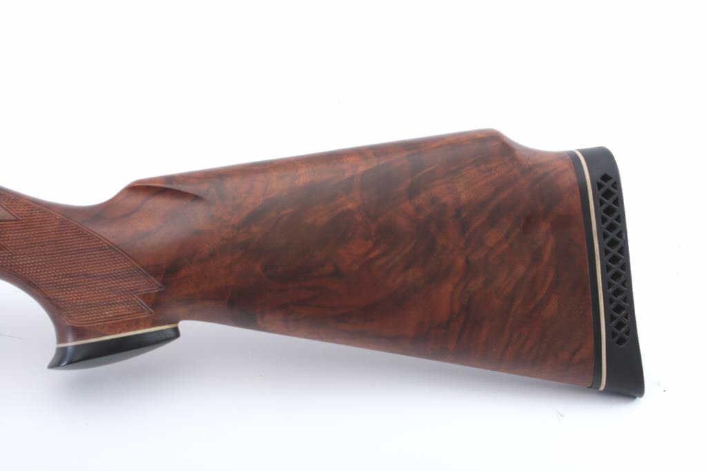 High Standard Supermatic Trap Model C1200, #3049141, 12 Ga., 2 3/4" chamber, 30" barrel, blued finish with deluxe checkered walnut stock with rubber recoil pad. Shotgun is in fine condition overall, retaining 96-98%original finish, with fine bore, good action, and very good wood. The initials D.L.M. are engraved on the rear of the receiver in electric pencil. (Modern) Est. $125-250