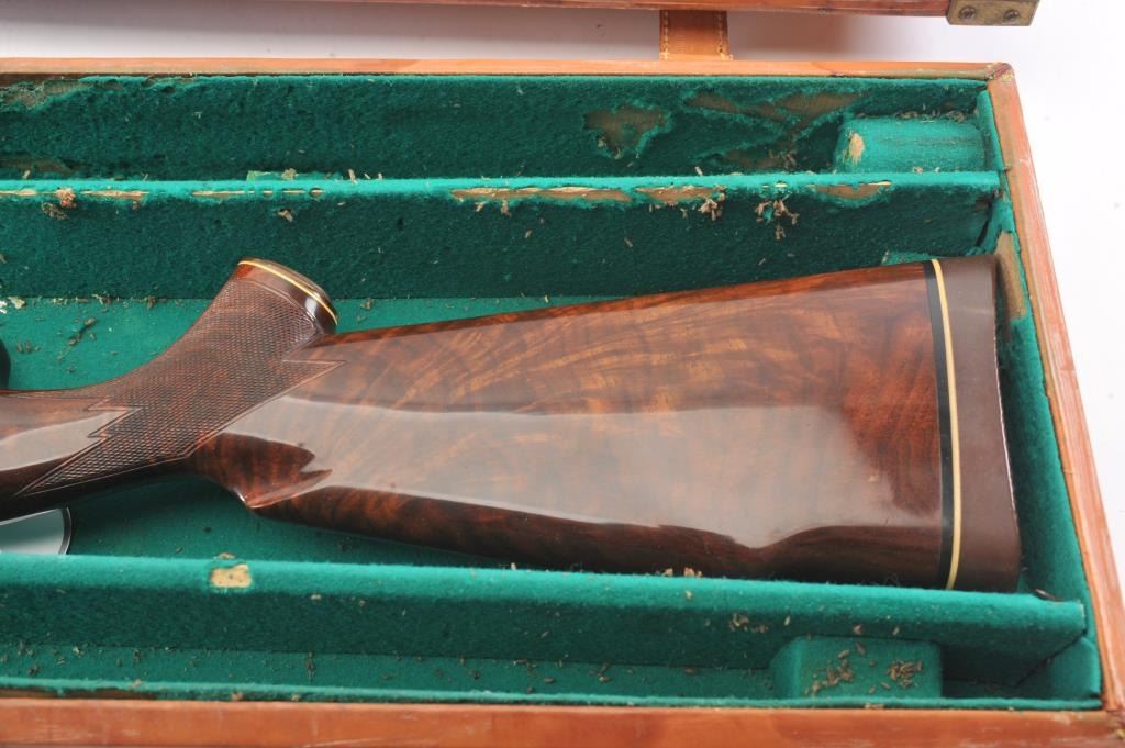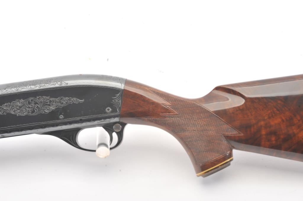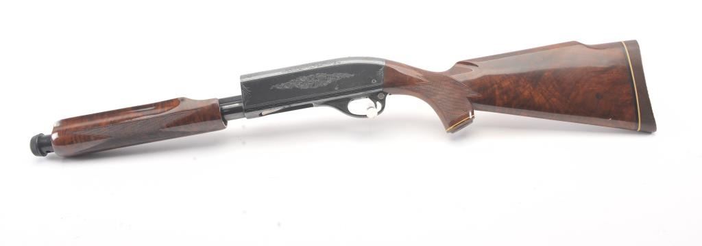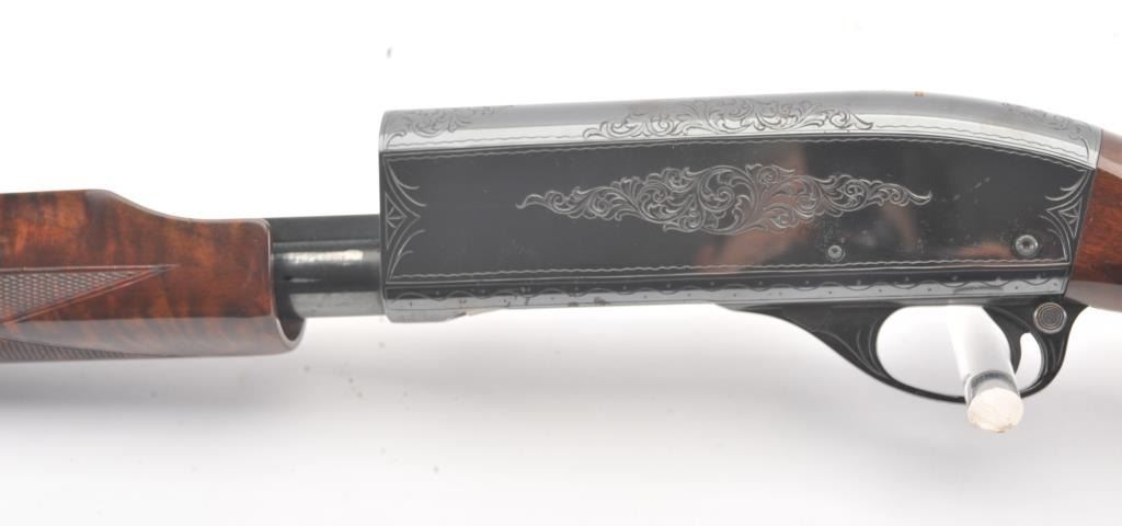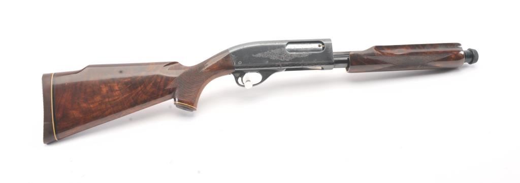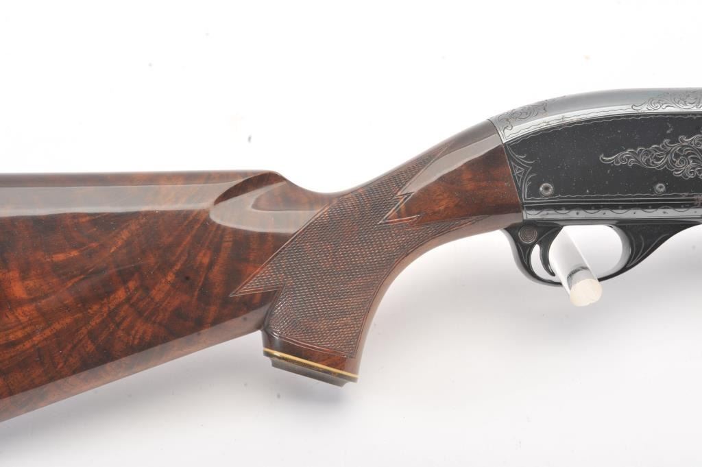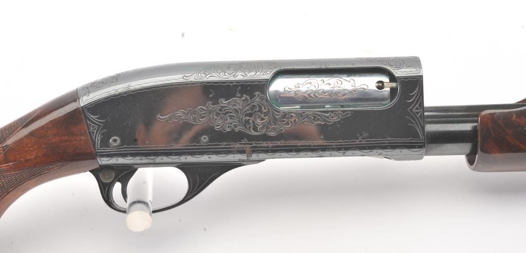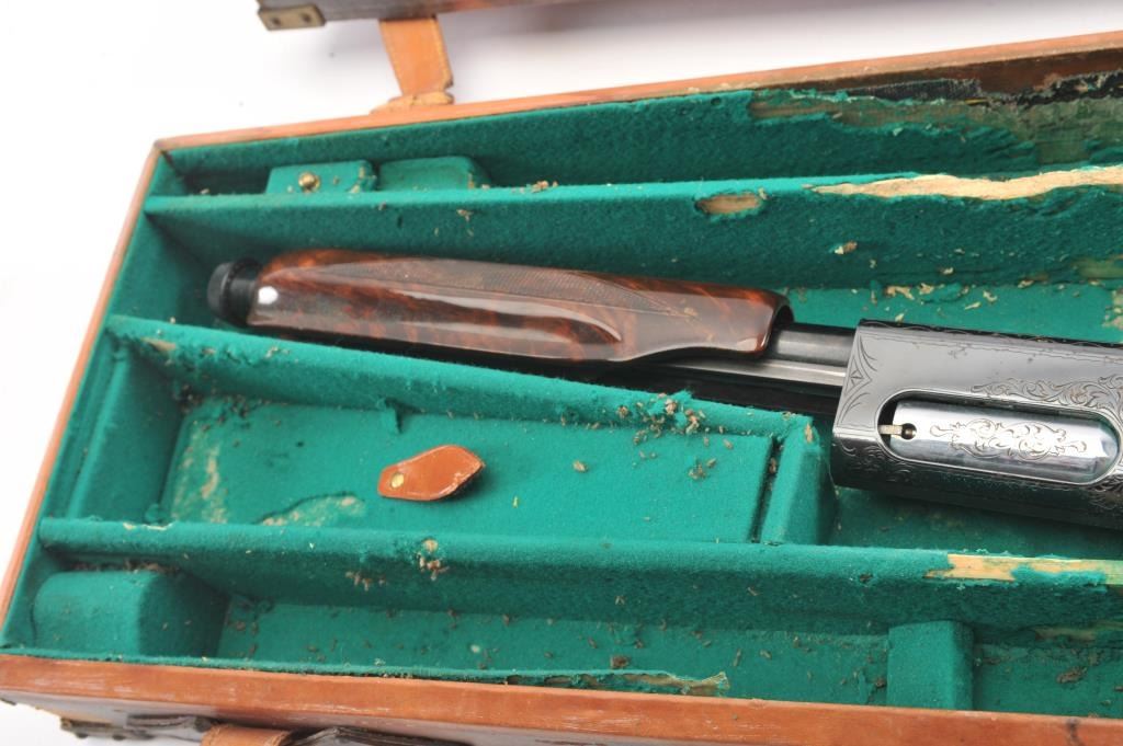 Remington Model 870 TD factory engraved with deluxe stocks, S/N S107814V. Measures 13 ½” to the end of the wood and 14 ¼” to the end of the pad. . 90%-95% blue with deteriorated case.(Modern) Est.: $500-1000
