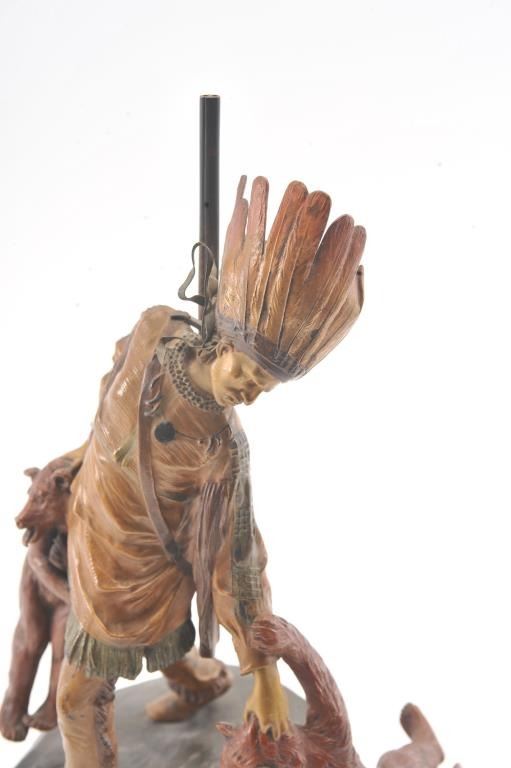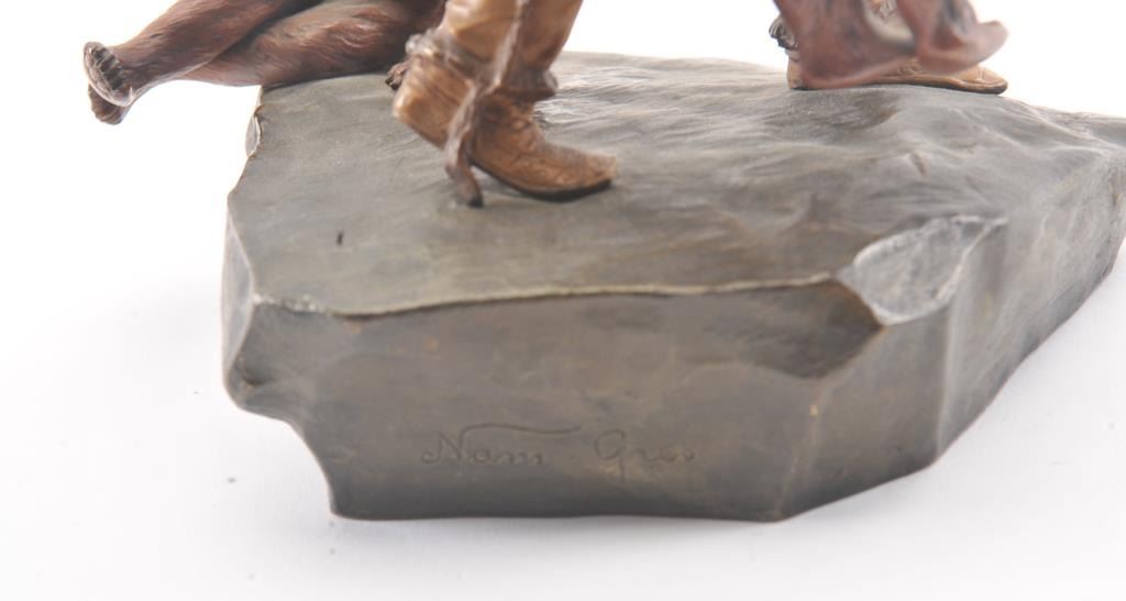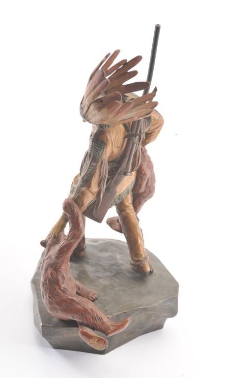 Late 19th to early 20th century polychromed bronze of American Native in buckskins with head dress carrying SxS shotgun on shoulder and two bears for supper. Measures approximately 11 ½” in height signed “NamGreb” on the base. Much in the style of Carl Kauba and of the same era. A very politically incorrect artwork sure to be banned by “Statetists” who ignore history and obscure reality. Provenance: Period of the WestGalleries James Fowler 1989. Est.: $750-1500