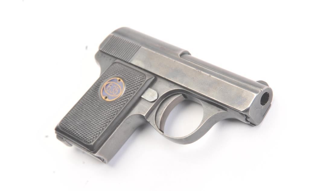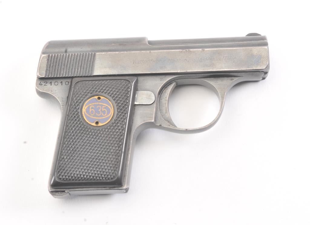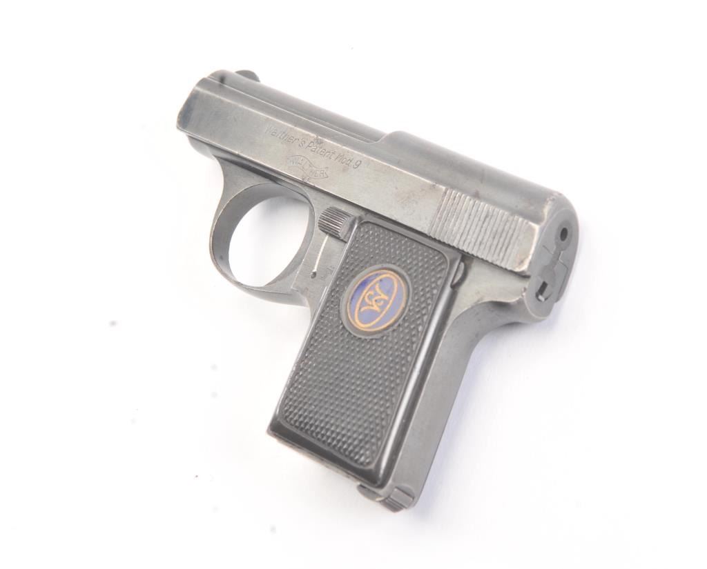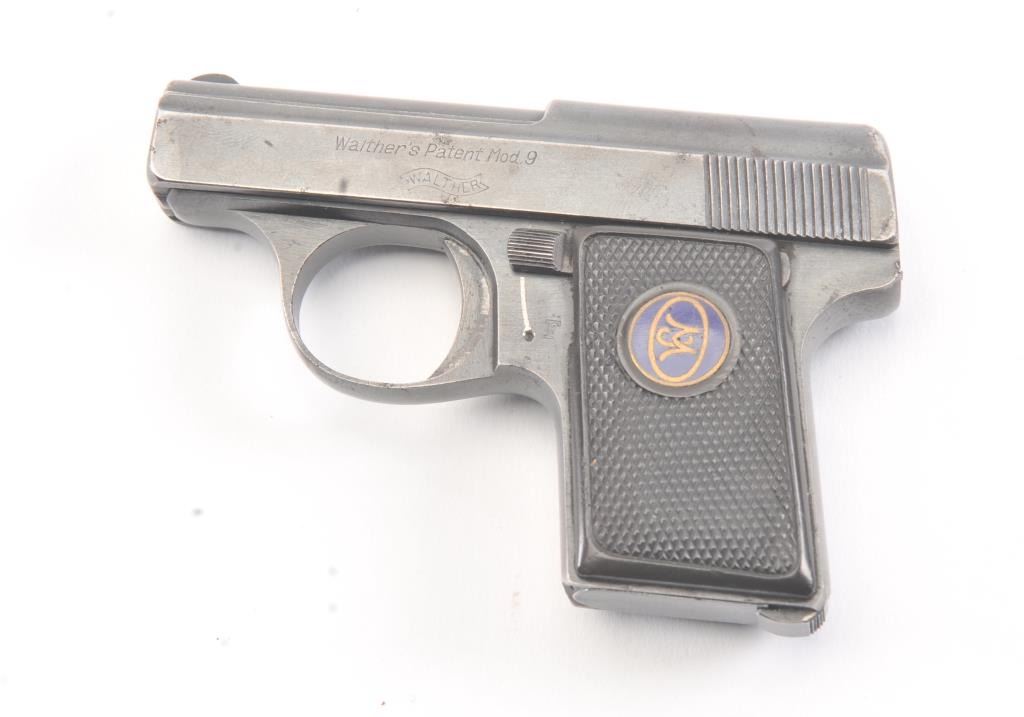 Walther Model 9 Semi Auto Pistol in .25 caliber S/N 421010 in very good condition. A very small pre-war auto not often encountered. 75%-85% original toning blue with very good grips showing enameled factory medallions. Correct mag. Good overall. Minor storage rust and erosion. A 7 1/2 on a 1-10 scale. (C&R/PPT) Est.: $300-600