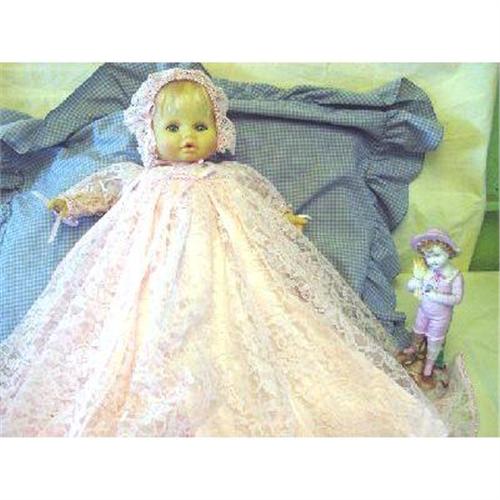20" Corolle French Blonde Babydoll. From Corolle in a beautiful long pink lace Christening gown with matching bonnet. Gorgeous baby has blonde blue-eyes and very sweet look. She is in excellent condition.