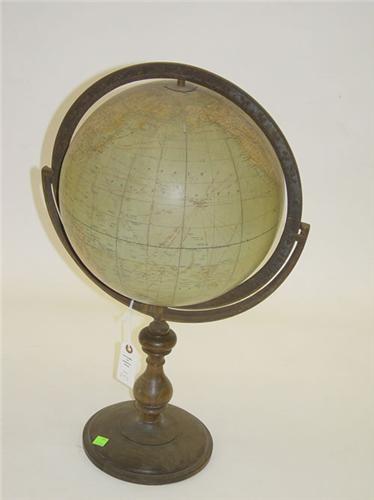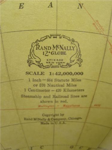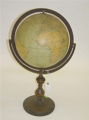 20TH CENT. 12" RAND MCNALLY GLOBE OF THE EARTH (CHICAGO & NY) IN A GRADUATED BRONZED FRAME ON A TURNED WOODEN BASE (15" W X 12" D) - EQUATORIAL CRACK FROM PERU TO BORNEO, WEAR & IMPERFECTIONS;