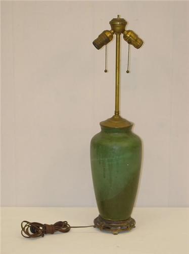 20TH CENT. ART POTTERY ELECTRIC TABLE LAMP W/ TWO TONE MATTE GREEN GLAZE & DRIP GLAZE (PROB. WELLER POTTERY) ON A DECORATED & MOLDED WHITE METAL BASE-MARKED L.D.B. & CO. (LAMP=27", POTTERY INSERT=12") - GLAZE DAMAGE, METAL OXIDATION, IMPERFECTIONS