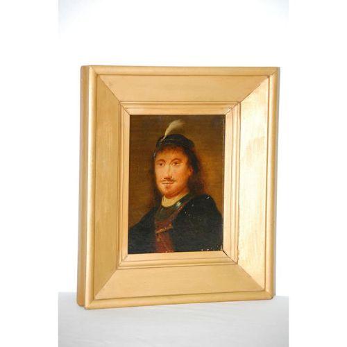 20TH CENT. CHROMOLITHOGRAPH PORTRAIT OF A GENTLEMAN IN THE 18TH CENT. CONTINENTAL MANNER-MOUNTED ON A WOODEN BOARD IN A GOLD PAINTED FRAME (7 3/4" X 5 3/4") -WEAR & IMPERFECTIONS