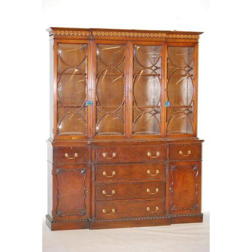 20TH CENT. CUSTOM CHIPPENDALE BUTLERS BREAKFRONT- MAHOGANY W/ 4 GLASS OVAL GLAZED DOORS OVER FALL FRONT BUTLERS DESK W/ 2 SHORT & 3 LONG DRAWERS & 2 CUPBOARD DOORS W/ BRASS HARDWARE (82" T X 66" W X 16" D) - WEAR, DESK FRONT REPAIRS, IMPERFECTIONS