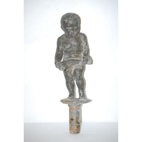 20TH CENT. FIGURAL GARDEN FOUNTAIN SPIGOT-FIGURAL LEAD SCULPTURE OF BOY W/ A LARGE FISH THAT POURS WATER FROM ITS MOUTH W/ PIPE FITTING FOR INSTALLING TO BASIN PLUMBING (21" X 7") - WEAR, SCRATCHES, DENTS, IMPERFECTIONS