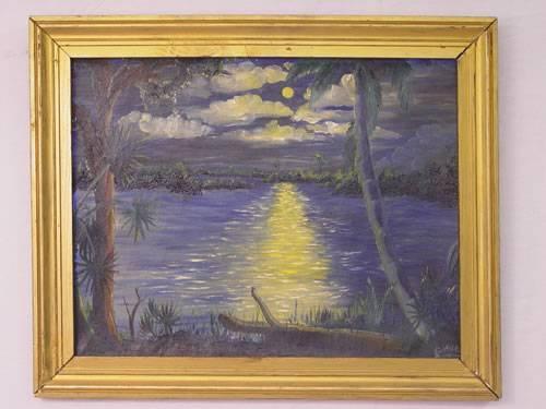 20TH CENT. FRAMED OIL ON CANVAS OF FLORIDA MOONLIGHT IN THE EVERGLADES SIGNED BOTTOM RIGHT FARLEY (17" X 21 1/2") - SOME PAINT LOSS & SEVERAL VERY SMALL HOLES IN CANVAS