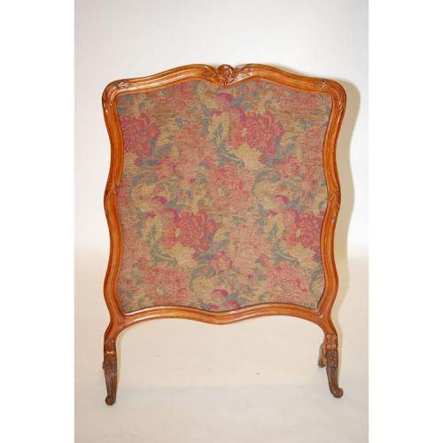 20TH CENT. FRENCH PROVINCIAL FIRESCREEN-MAHOGANY LOUIS XV STYLE W/ FLORAL & FOLIAGE CARVED SHIELD SHAPED FRAME, SHORT CARVED CABRIOLE LEGS & FLORAL TAPESTRY FABRIC INSERT (37 1/4" T X 27" W X 11 1/4" D) - WEAR, REPAIRS, IMPERFECTIONS