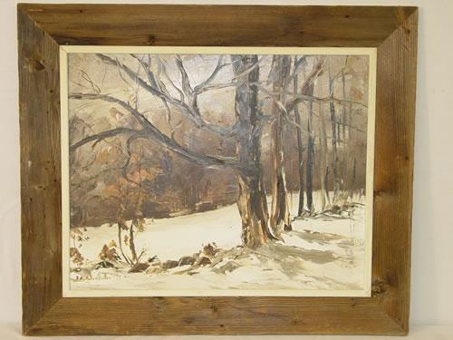 20TH CENT. OIL ON CANVAS "MAPLES IN WINTER" SIGNED IDA WASLASKE, ATHOL MA IN WIDE ROUGH PINE FRAME (23" X 29")