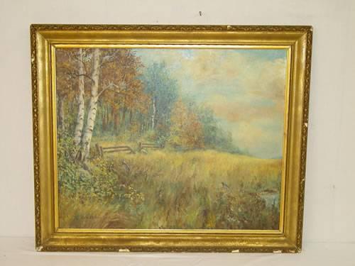 20TH CENT. OIL ON CANVAS OF MEADOW LANDSCAPE W/ BIRCH TREES SIGNED JOHN RENFREW DEAN (ILLUSTRATOR FOR FIELD & STREAM MAGAZINE) IN MOLDED PLASTER FRAME (25 1/2" X 31") - LOSSES TO FRAME, CRAQUELURE;
