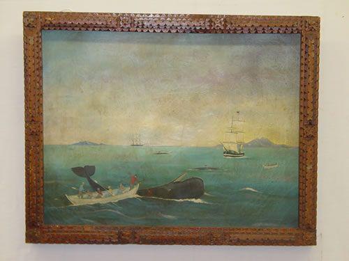 20TH CENT. OIL ON CANVAS OF WHALING SCENE W/ SHIPS & ISLAND BACKGROUND, UNSIGNED IN A TRAMP ART FRAME (16" X 21") - CRAQUELURE