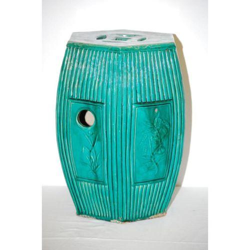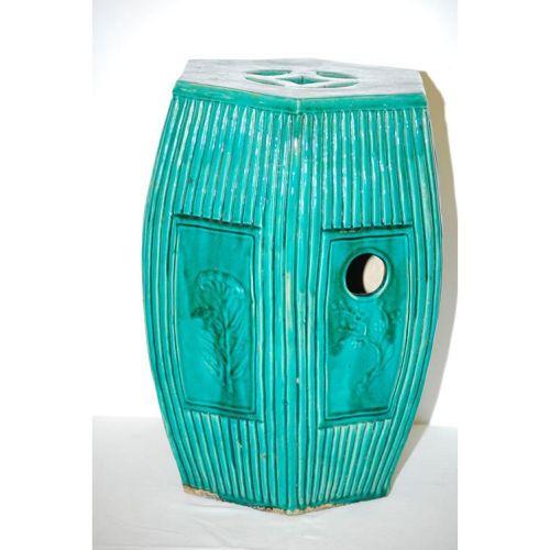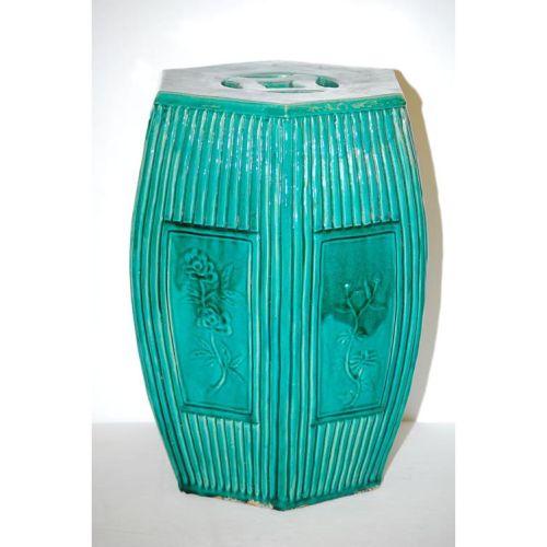 20TH CENT. ORIENTAL GARDEN SEAT - STONEWARE HEXAGONAL SHAPE W/ RIBBED SIDES & FLORAL PANELS W/ PIERCED CUT CASH COIN ON TOP, IN A VERDIGRIS COLORED BLUE GREEN GLAZE (17 1/2" T X 13" W) - WEAR, IMPERFECTIONS