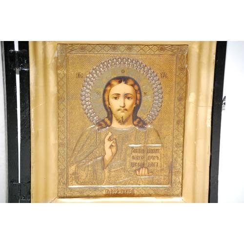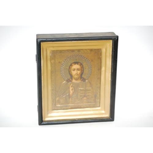 20TH CENT. RUSSIAN RELIGIOUS ICON OF JESUS CHRIST IN THE ARCHAIC MANNER W/ A GILT & POLYCHROME TIN LITHO PORTRAIT W/ CYRILLIC TITLE IN A GILT FRAME & BLACK SHADOW BOX (8 1/2" X 6 1/2") - WEAR, OXIDATION, IMPERFECTIONS
