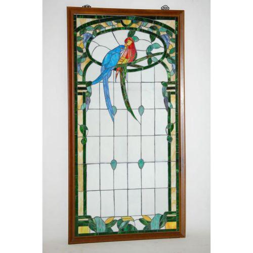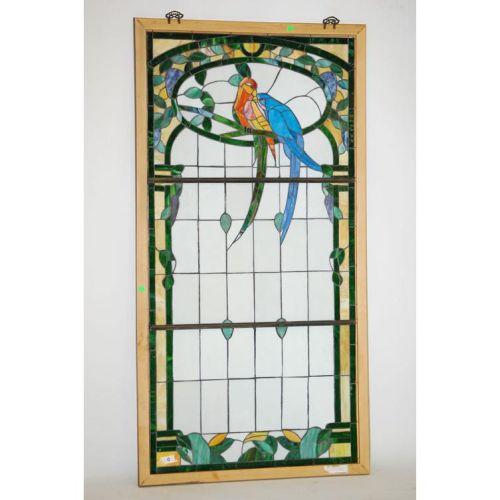 20TH CENT. STAINED GLASS WINDOW - LEADED POLYCHROME SLAG & WHITE GLASS DEPICTING 2 PARROTS W/ LEAFY BORDER, FRAMED (60" X 29 1/2") - GOOD CONDITION