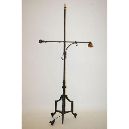 20TH CENT. WROUGHT IRON BRIDGE ELECTRIC FLOOR LAMP- HEAVY WROUGHT IRON W/ WEIGHTED SWING ARM W/ BRASS URN FINIAL & LEAFY SOCKET COVER IN BLACK PAINT (67" T X 30" W) - WEAR, OXIDATION, IMPERFECTIONS