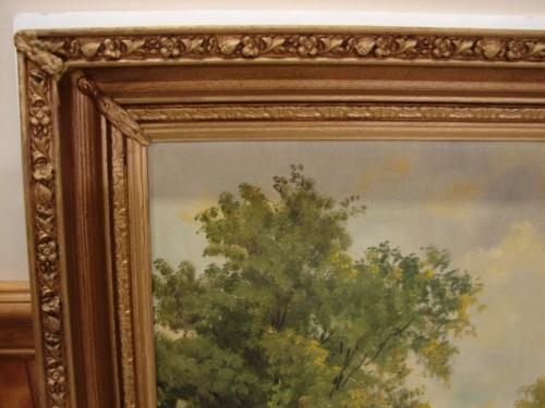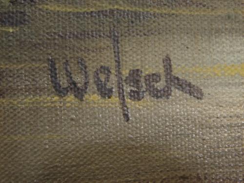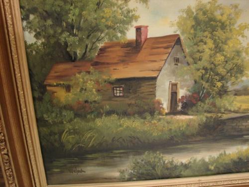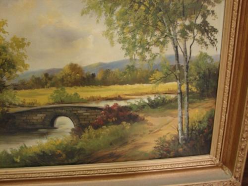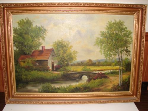 20TH CENTURY OIL ON CANVAS PAINTING. Depicts a stream scene with a cottage and bridge. Signed in lower left “Welsch”. 41.5” x 20.5” framed.