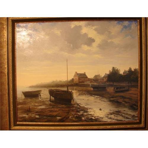 Circa 1980 European Landscape Painting Signed by Artist. Raymond Quence was born in the United States in 1932 and to my knowledge is still living. I have taken a few closeups of this artists signature. More images are available upon request. Even though Quence was born in America, most of his paintings were painted in Europe. This painting's canvas measures 29" X 24". Recently I purchased this painting out of a house in Houston, Texas along with three graduated sizes Chinese Export 18th Century Tobacco Leaf Platters. The frame mewasures 36" X 31". This artist is particularly known for european landscapes with boats and houses and chateaus and also did many impressionist paintings. Nicely painted scene of several boats docked in shallow water with nioce trees, houses and sky in the background. Quence has auction records and is listed in Ask Art and Artnet as well as Davenports. Additional images are available upon request.