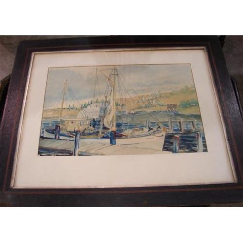 First half of the 20TH. Century of old Watercolor of Rockport School Painting of Fishing Boat tied up to Harbor Port. Measuring 11 1/2" X 17". Good Condition. It comes with its original matte and inlaid 18 1/2" X 24" Frame. The bottom left hand corner of frame had some damage which I personally repaired. This is fresh out of a New England Estate along with some other Nautical oils, watercolors, and gouaches. Boat is signed on the bow, ROMER and on the mast on the far left hand side just above the cabin is signed "ROAMER". More images are available upon request.