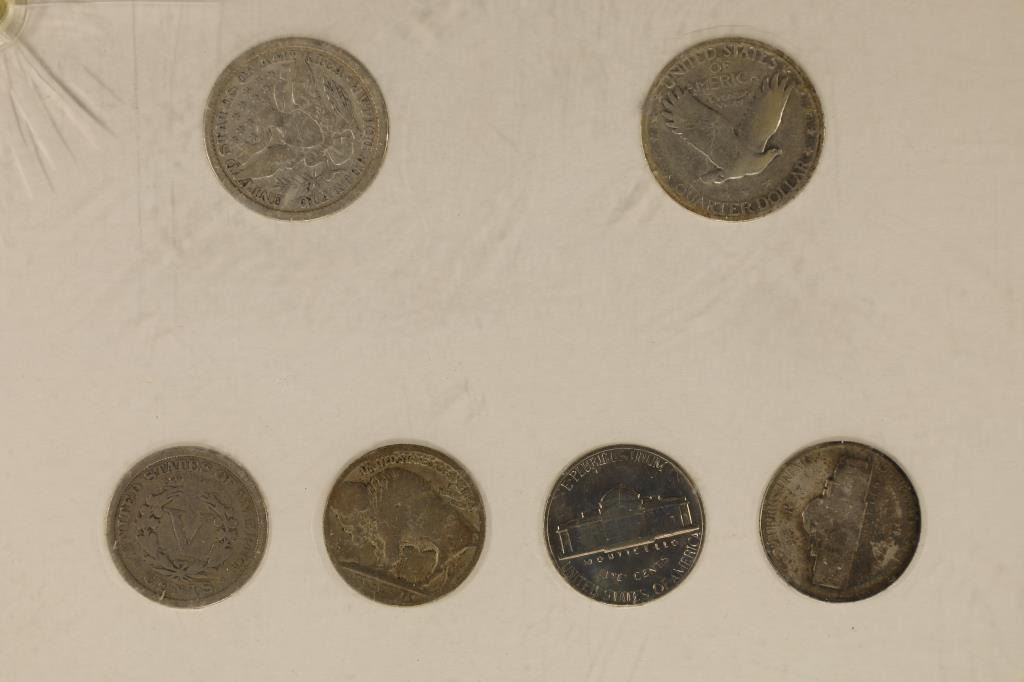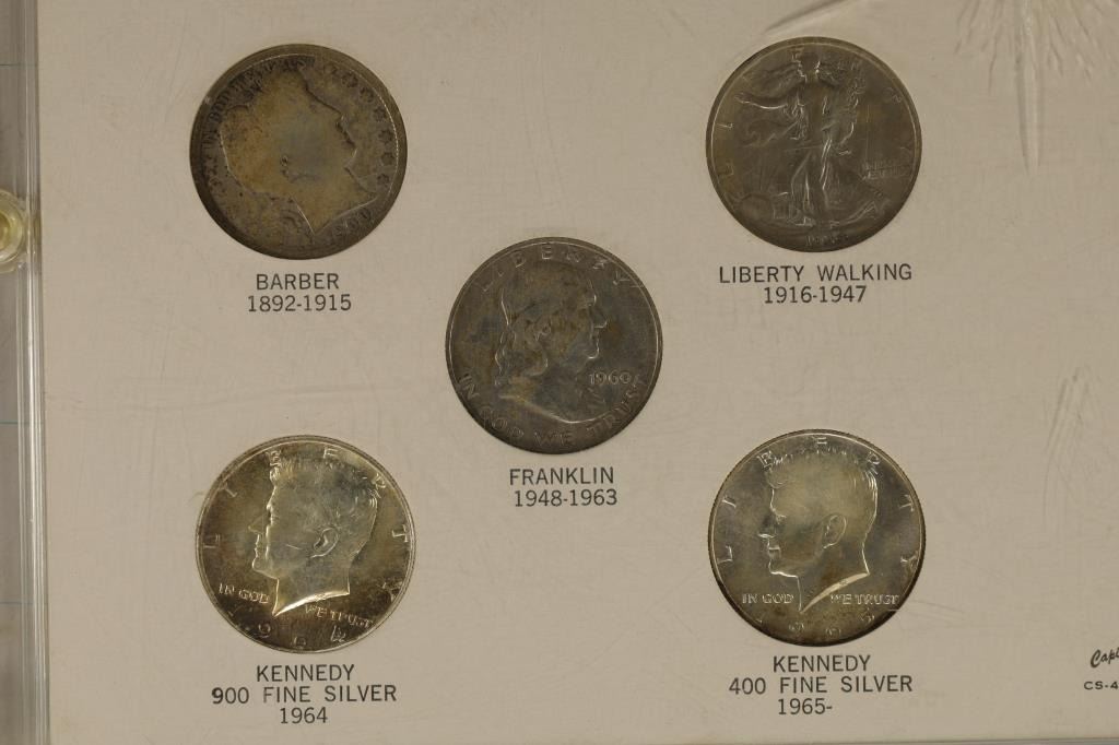 PLASTICS HOLDER: 1922 PEACE SILVER DOLLAR AU++, 1881-S MORGAN SILVER DOLLAR (UNC), 1964 90% SILVER KENNEDY HALF DOLLAR AU+, 1965 40% SILVER JOHN F. KENNEDY HALF AU+, 1960 90% FRANKLIN HALF DOLLAR, 1934 SILVER WALKING