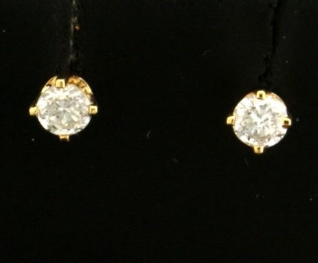 In 14k yellow gold. Each earring contains a high quality .10ct round diamond with G color/I clarity and very white stones. With friction backs. 0.5g.