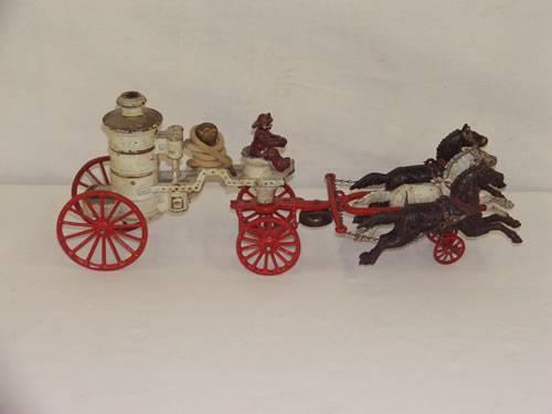 20" HUBLEY CAST IRON HORSE DRAWN STEAMER W/ DRIVER and 3 HORSES - REPAINTED IN SPOTS, WEAR;