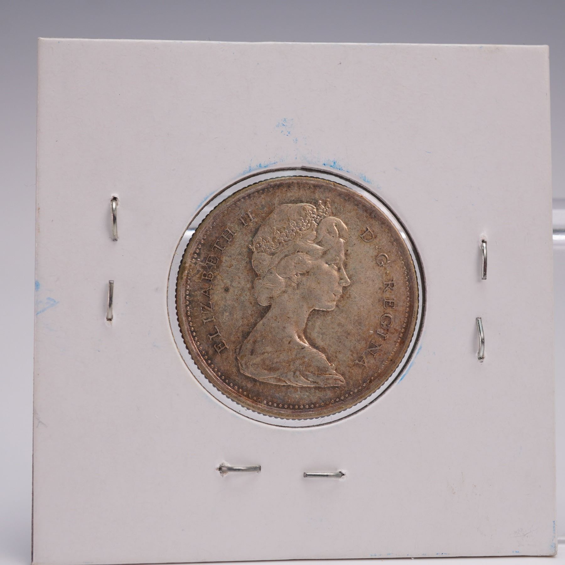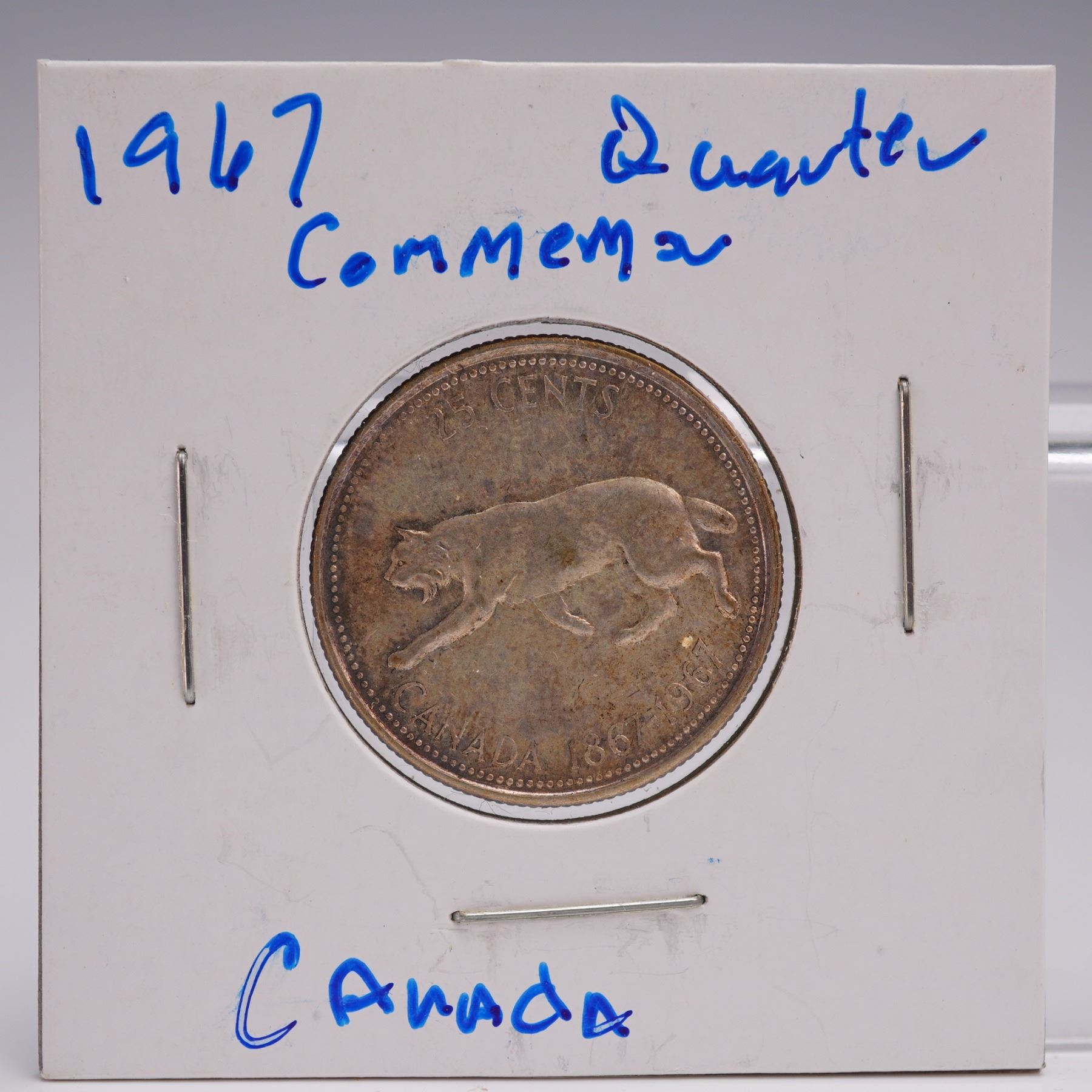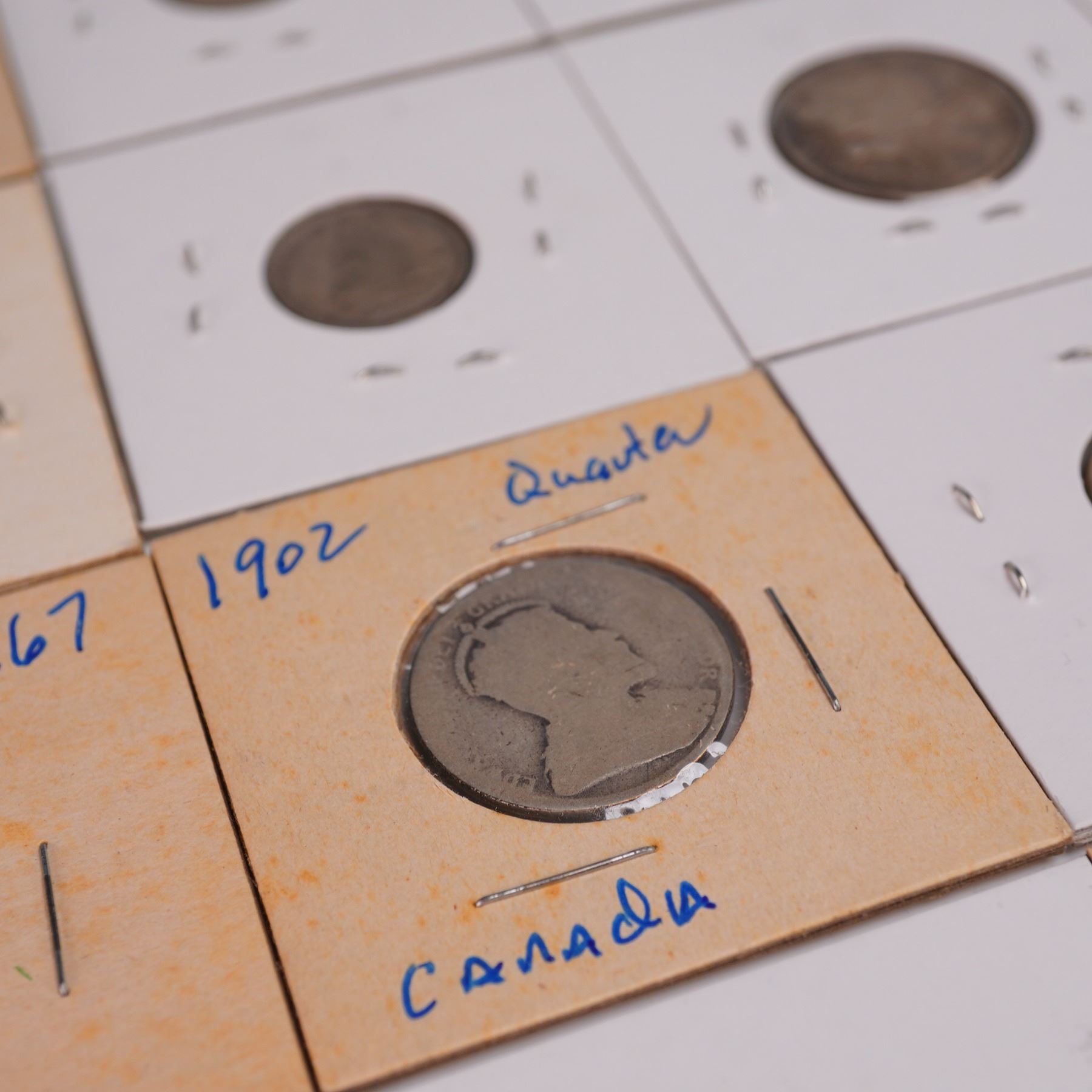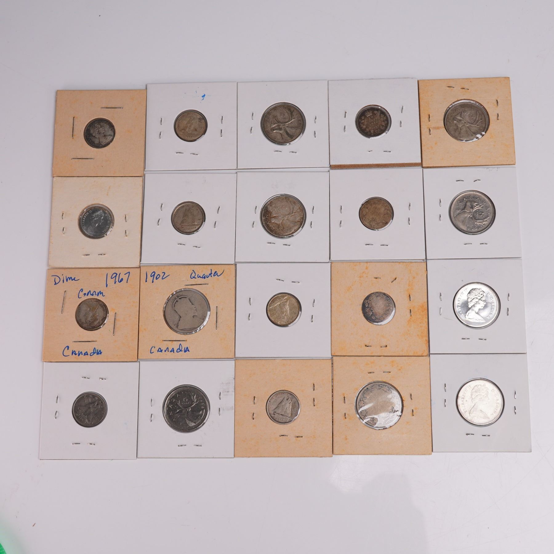 A diverse group of twenty vintage Canadian coins comprising both dimes and quarters, spanning the early 20th century through the late 1960s. The lot includes nine Canadian dimes dated 1903, 1909, 1947, 1959, 1964, 1967 - with three examples, and 1968, along with two additional dimes lacking visible dates. Also present is one undated Canadian quarter, accompanied by eight additional quarters dated 1902, 1953, 1964 (two examples), 1967 (two examples, featuring the Centennial bobcat design), 1968, and a 2004. Many of the coins exhibit Canada's evolving portraiture and reverse motifs, including both pre- and post-decimal issues struck in silver and later nickel compositions. Each coin is individually housed in cardboard slab for display and further preservation. Cardboard slabs measure: 2"L x 2"H. Coin's diameter (Dime) : 18.03 mm. Coin's diameter (Quarter): 23.88 mm.
