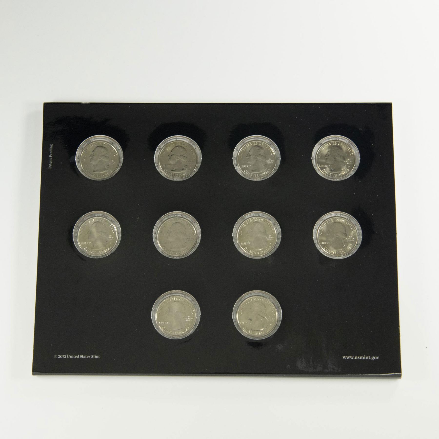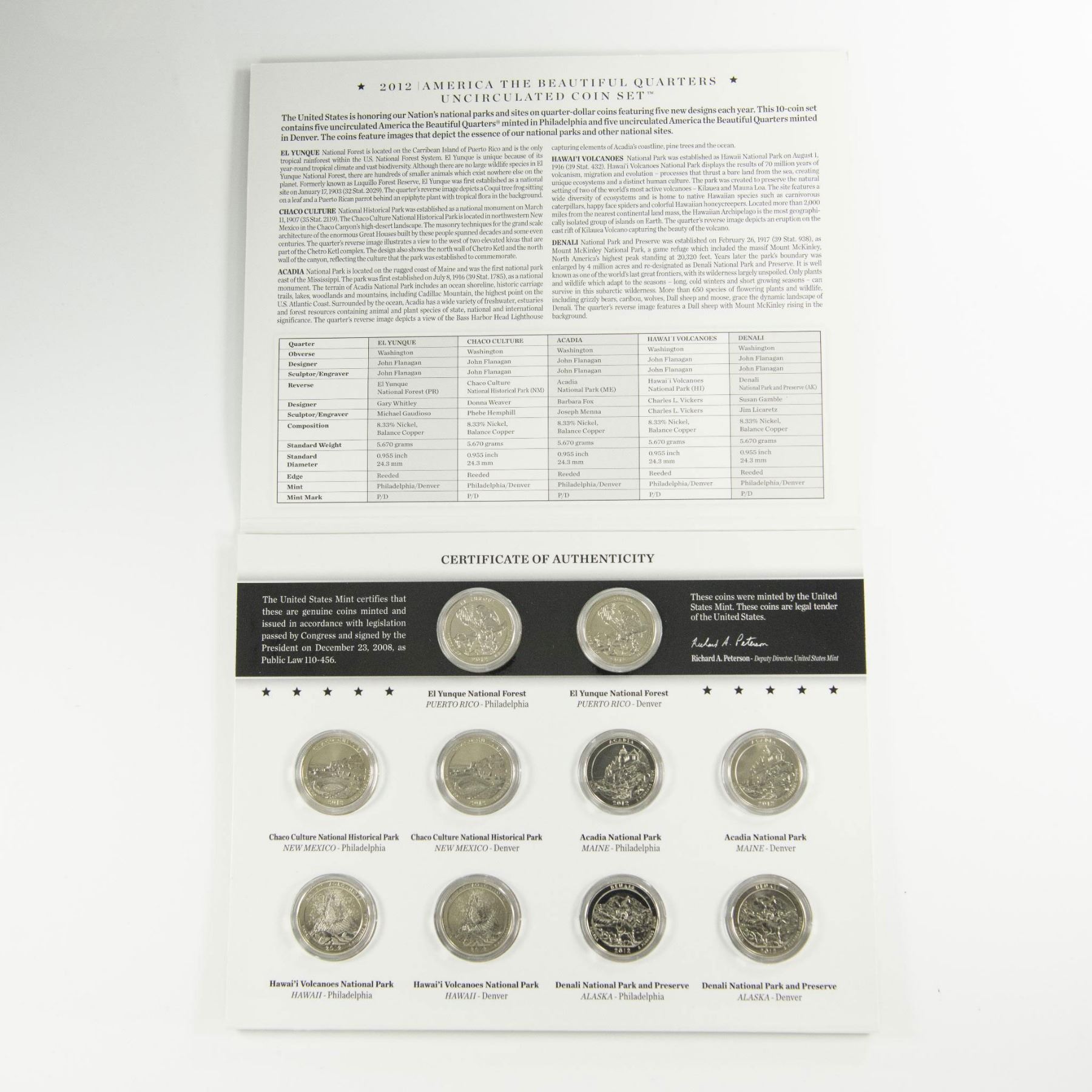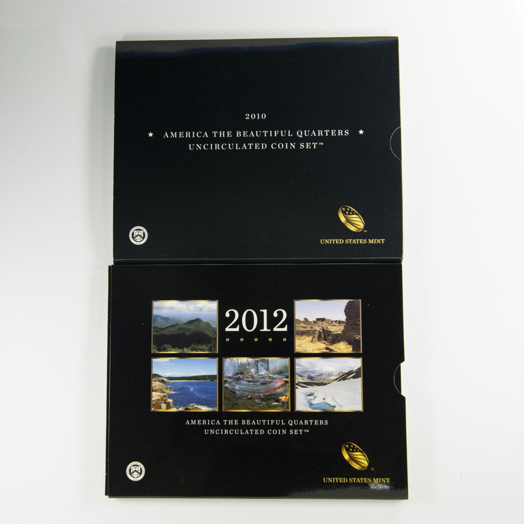 Collection includes 2 original United States Mint packaging for 2010 and 2012. Each package contains 10 America the Beautiful Quarters. Of which from those 10 quarters, 5 are Uncirculated Philadelphia Mint, and 5 Uncirculated Denver Mint. 2010 quarters reverse side depicts US National Parks: Hot Springs from Arkansas; Yellowstone from Wyoming; Yosemite from California; Grand Canyon from Arizona; and Mount Hood from Oregon. 2012 quarters reverse side features: El Yunque from Puerto Rico; Chaco Culture from New Mexico; Acadia from Maine; Hawaii Volcanoes from Hawaii; and Denali from Alaska. Each coin is in a protective case and displayed in the US Mint packaging. The packaging is approximately: 8.25"L x 0.25"W x 6.5"H.