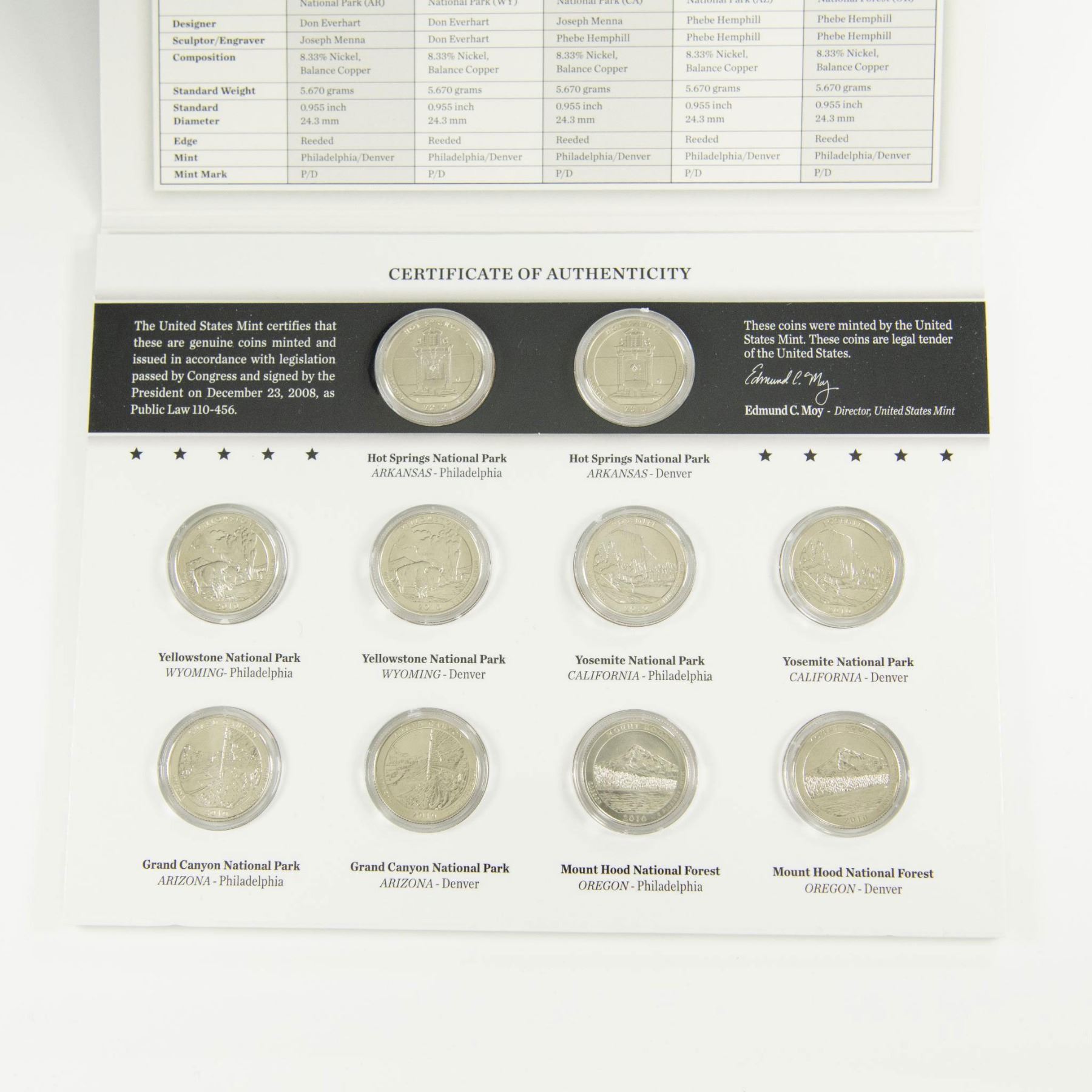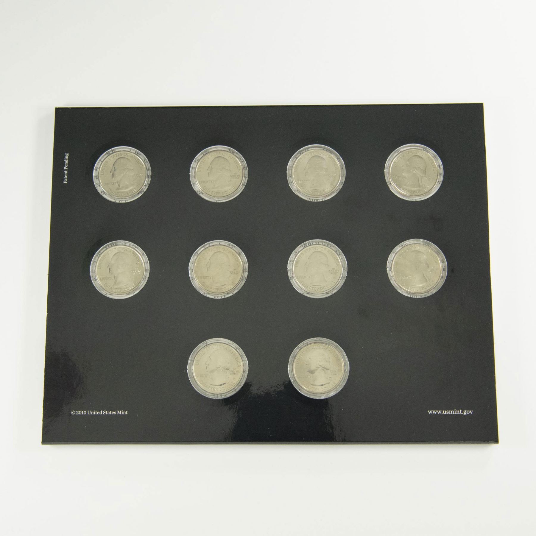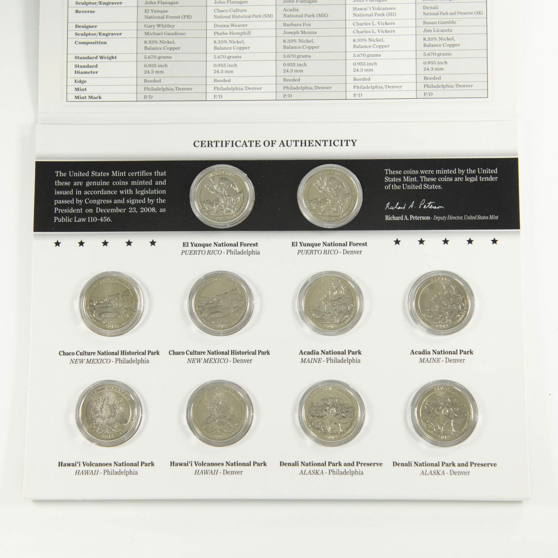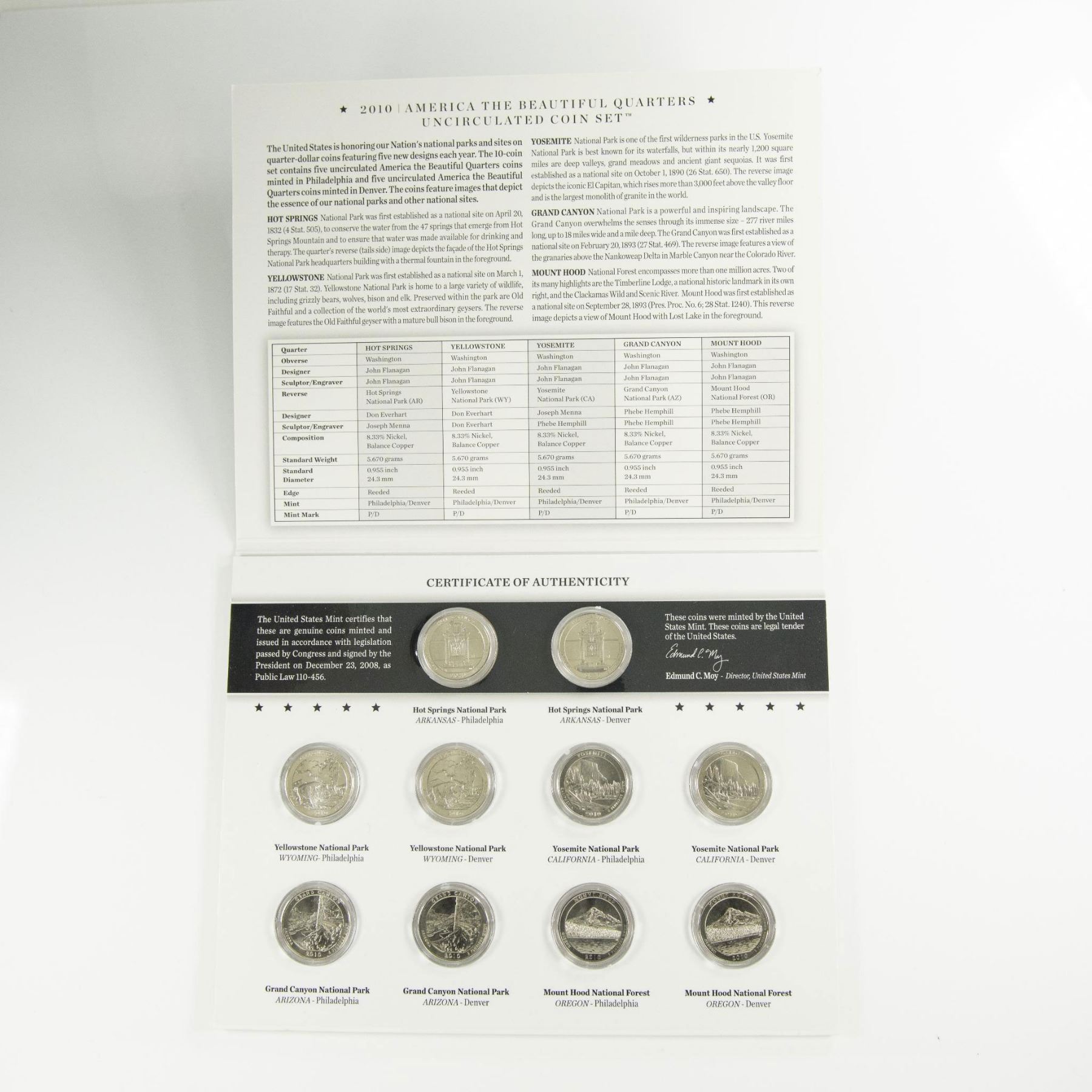 Collection includes 2 original United States Mint packaging for 2010 and 2012. Each package contains 10 America the Beautiful Quarters. Of which from those 10 quarters, 5 are Uncirculated Philadelphia Mint, and 5 Uncirculated Denver Mint. 2010 quarters reverse side depicts US National Parks: Hot Springs from Arkansas; Yellowstone from Wyoming; Yosemite from California; Grand Canyon from Arizona; and Mount Hood from Oregon. 2012 quarters reverse side features: El Yunque from Puerto Rico; Chaco Culture from New Mexico; Acadia from Maine; Hawaii Volcanoes from Hawaii; and Denali from Alaska. Each coin is in a protective case and displayed in the US Mint packaging. The packaging is approximately: 8.25"L x 0.25"W x 6.5"H.