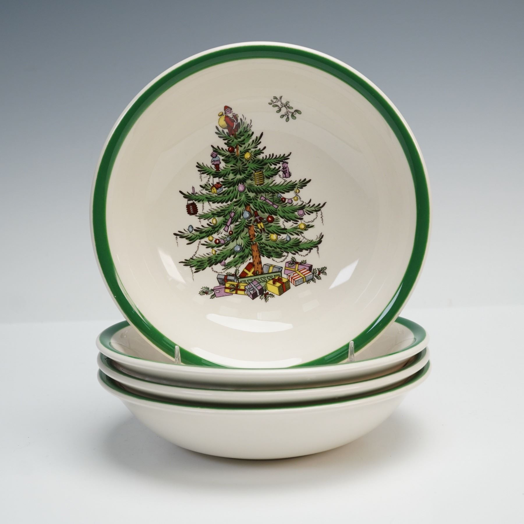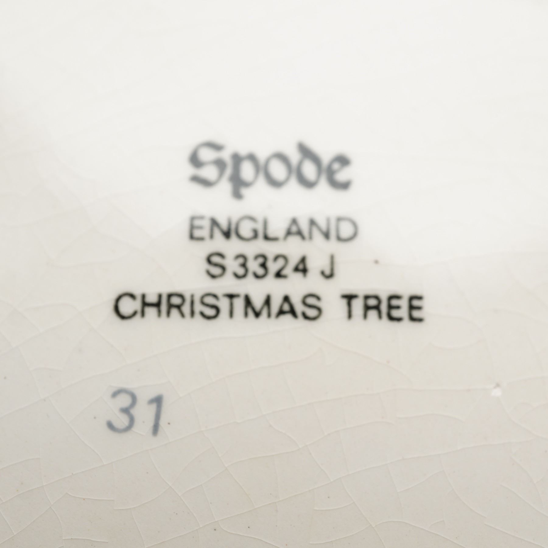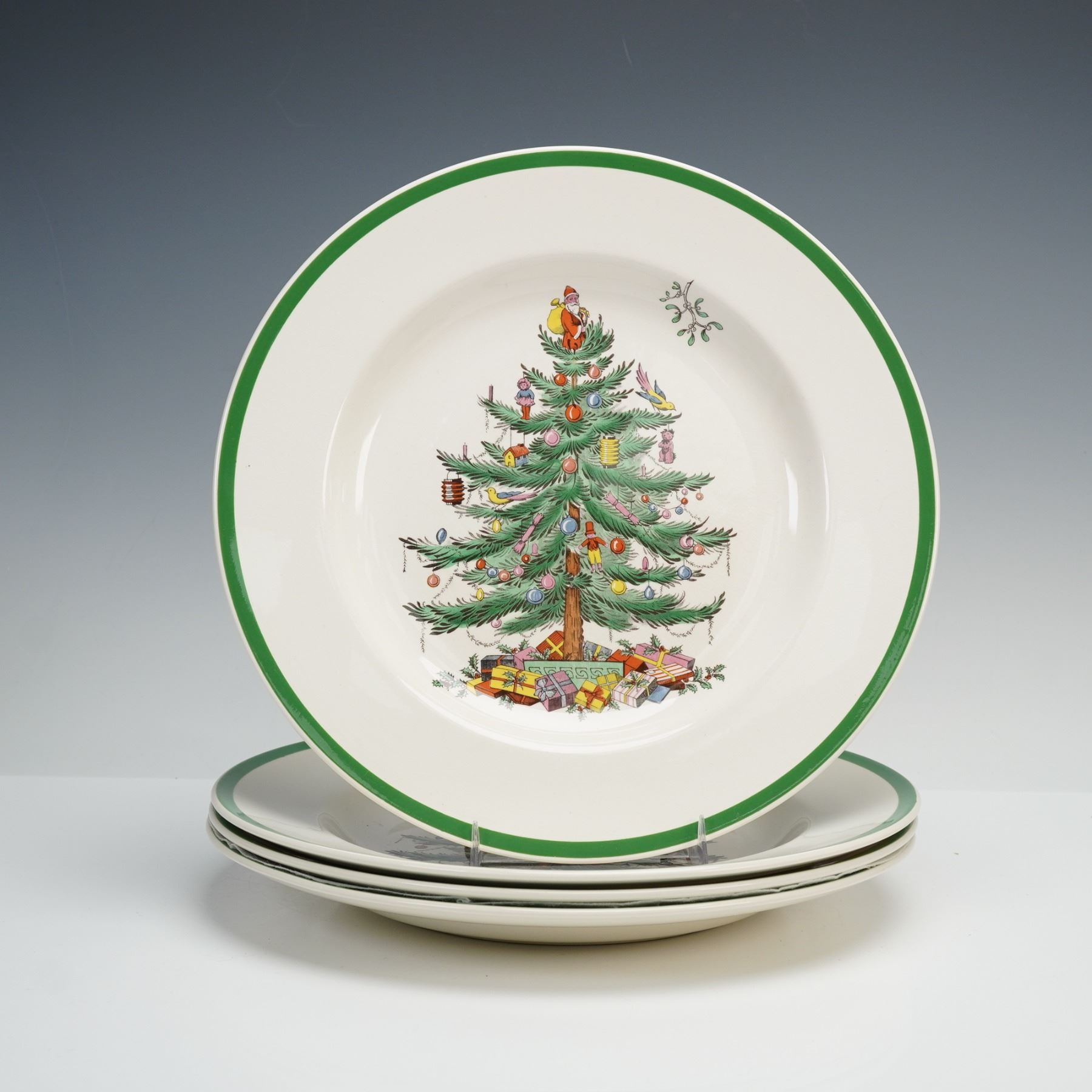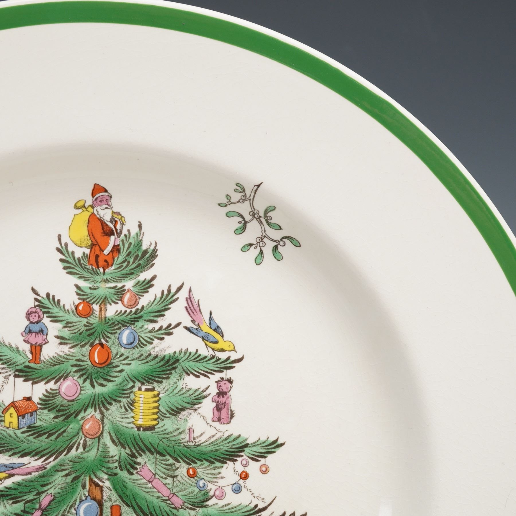 This 20 piece Spode Christmas Tree dinnerware set includes 4 dinner plates, 4 salad plates, 4 bowls, and 4 cups with saucers, all featuring the iconic Christmas tree design. The vibrant green trim and detailed holiday imagery, including Santa and festive decorations, make it a perfect addition to your seasonal dining collection. The set is backstamped Spode England S3324 Christmas Tree, a classic pattern that brings holiday cheer to any table.