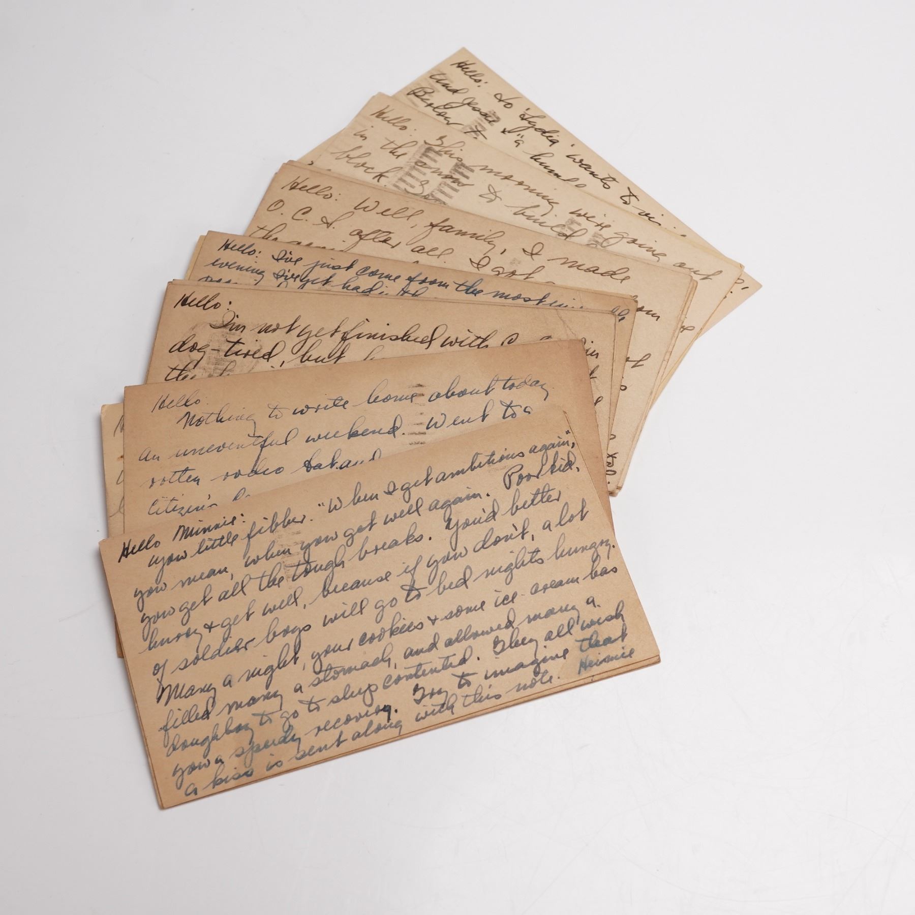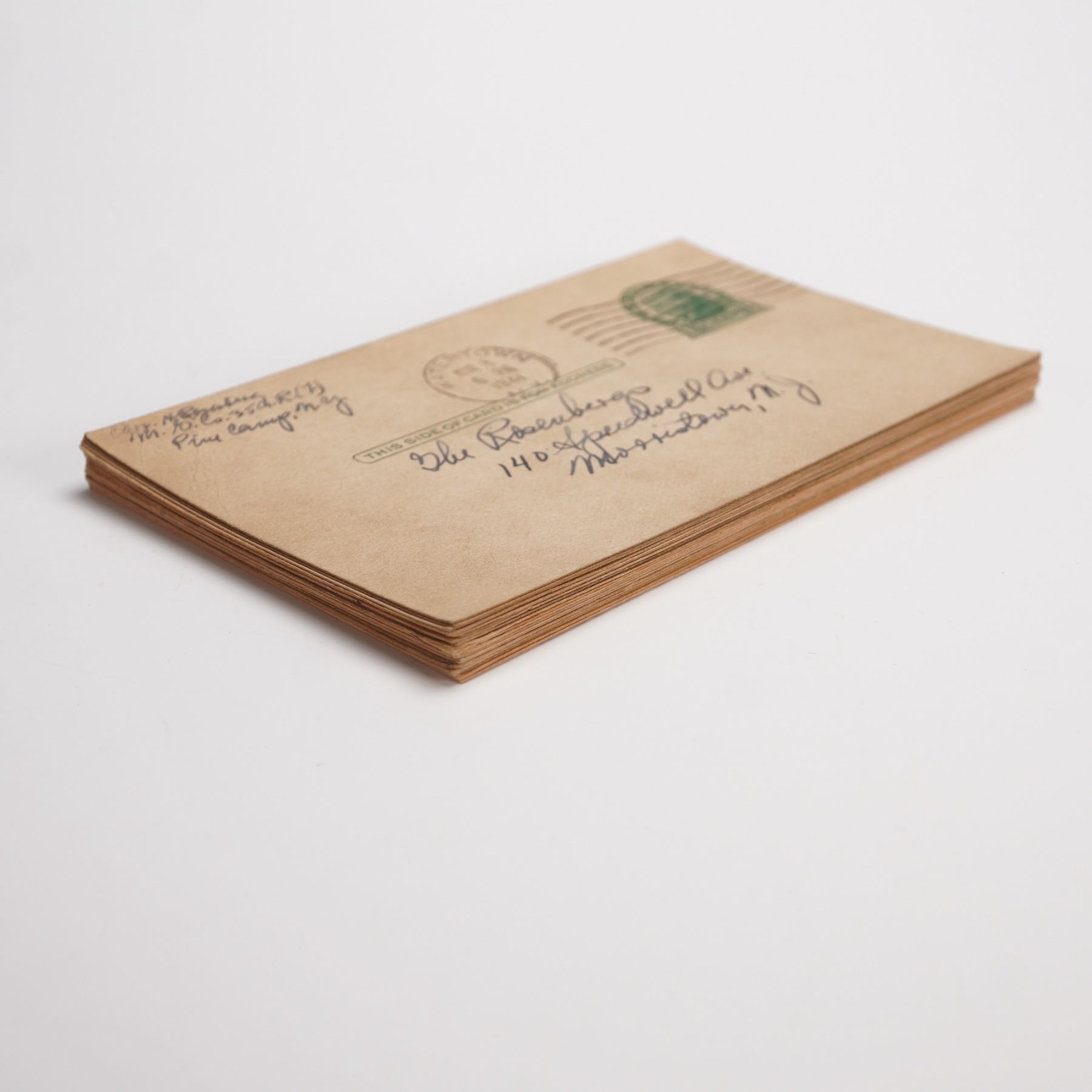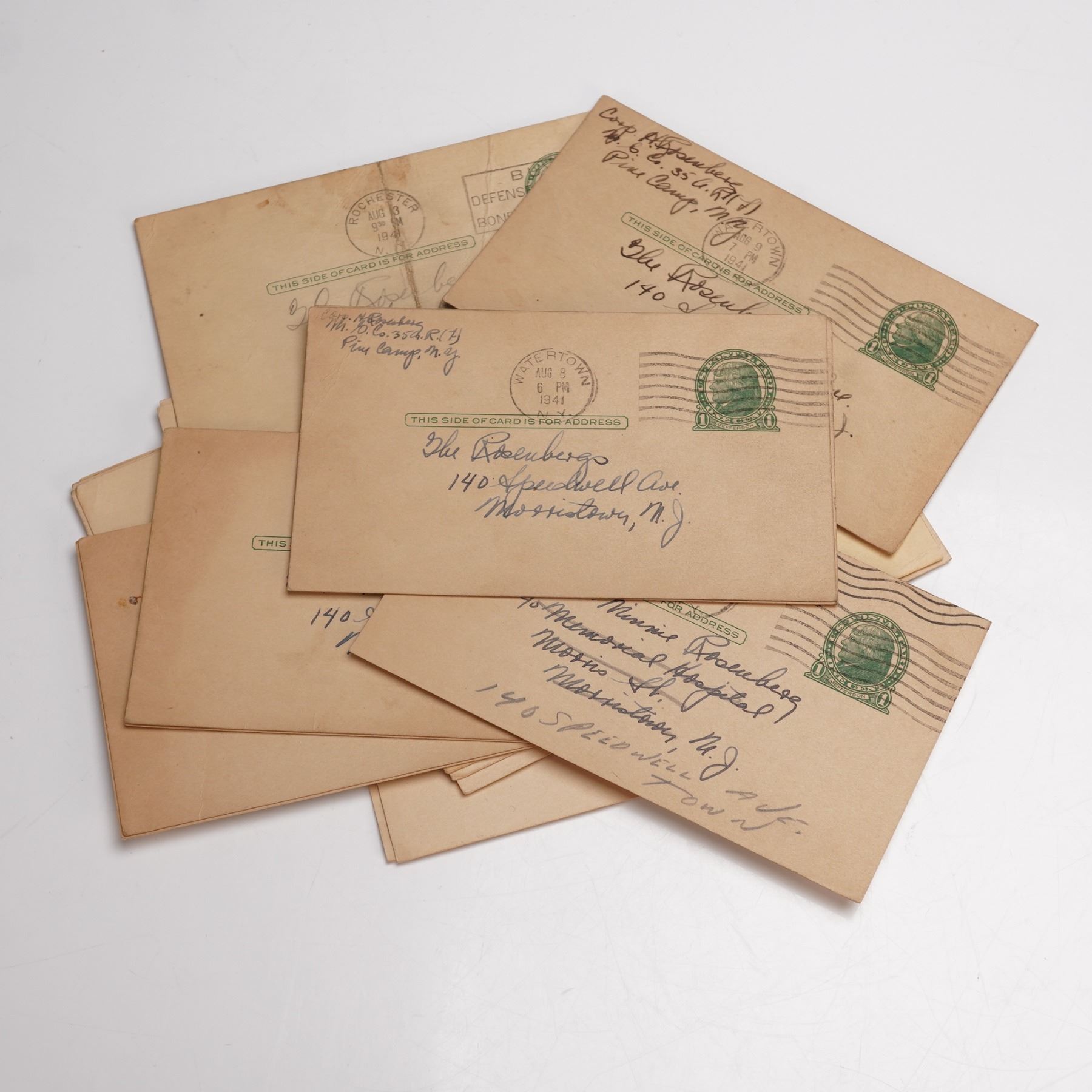 Group of 20 World War II era US Army postal cards sent in 1941 and 1942 by H. Rosenberg from Pine Camp, New York, to family in Morristown, New Jersey. Each card carries handwritten correspondence on one side and address details on the other, with postmarks stamped Watertown, N.Y., the nearest post office to Pine Camp. The set reflects everyday communication between soldier and home during the early war years and preserves both postal history and a personal link to military life at Pine Camp, later known as Fort Drum.