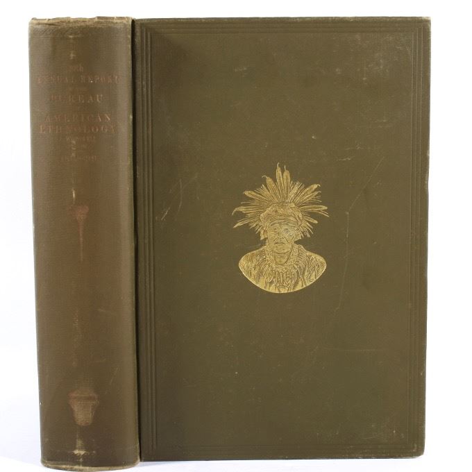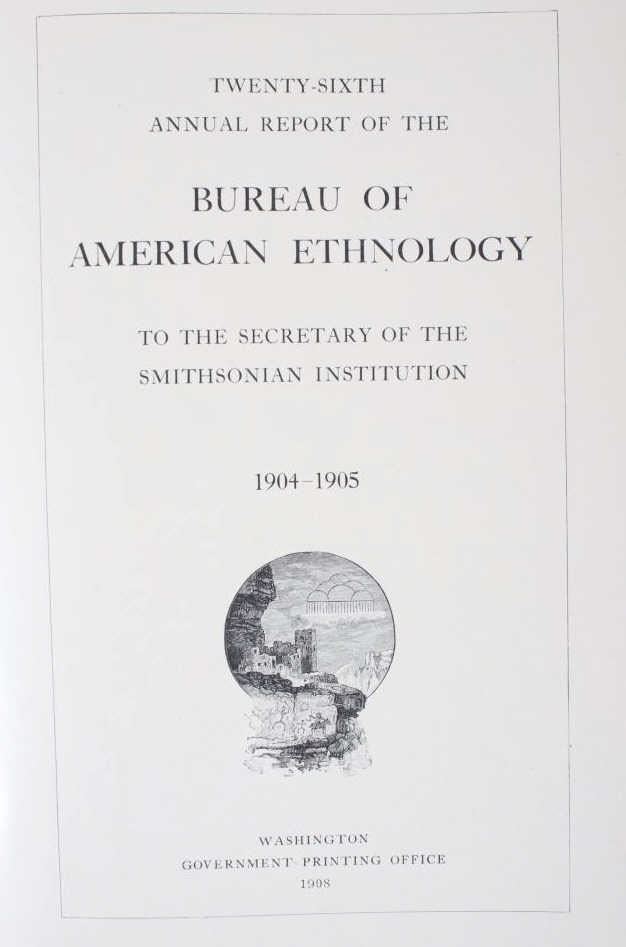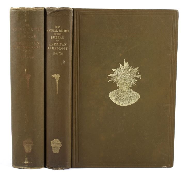 Included in this lot we have the 20th and 26th annual Bureau of American ethnology reports from 1898 to 1899 and 1904 to 1905. The reports where sent from the Bureau to the secretary of the Smithsonian institution. The 20th report shows 461 pages, with numerous black and white photographs and text illustrations. The 26th annual report shows 512 pages with 47 pages of black and white photographs near the center of the book with many other photos and illustrations. The 20th and 26th Annual Reports of the Bureau of American Ethnology to the Secretary of the Smithsonian Institution 1898-1899 and 1904- 1905 is published Government Printing Office Washington 1903 and 1908 first printings. The books show good condition overall with some light wear indicative of age. The covers measure 11 3/4" tall by 8 1/4" wide with them measuring 2 1/4" and 1 3/4" thick respectively.