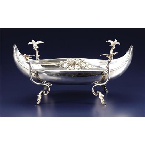 <B>An American Silver Centerpiece Bowl</B></I><BR><BR>Unknown maker, American<BR>Twentieth Century<BR>Silver<BR>Marks: (effaced) <I>STERLING, 925</B></I><BR>5.88 inches high x 12.88 inches long x 8 inches wide<BR>32.81 Troy ounces<BR><BR>Of boat form with cast floral decoration to sides of interior, raised on four scroll feet ending in leaves, mounted with birds.<BR><BR><b>Shipping:</b> Requires 3rd Party Shipping (<a target="_blank" href="http://www.heritageauctions.com/common/shipping.php">view shipping information</a>)