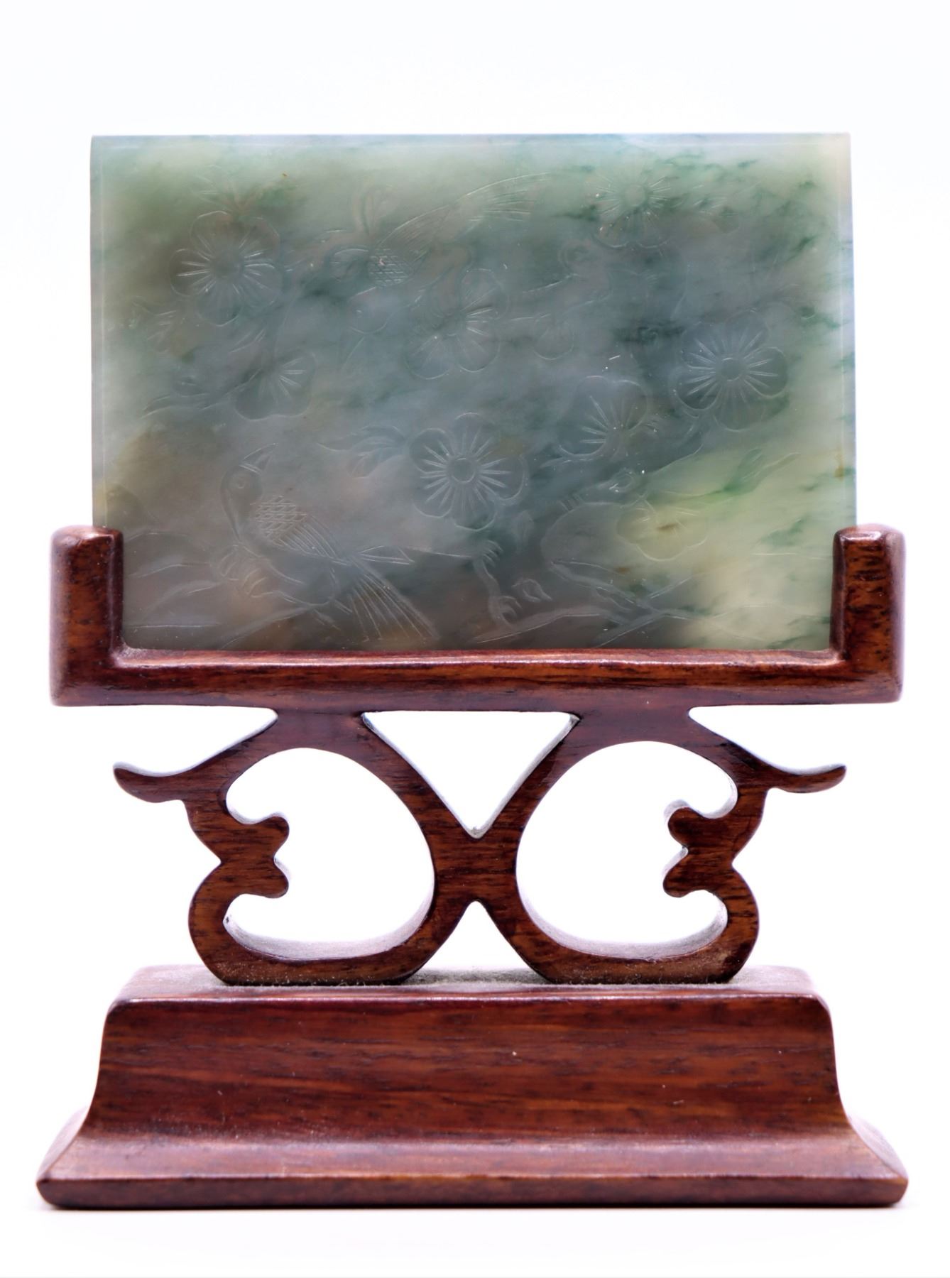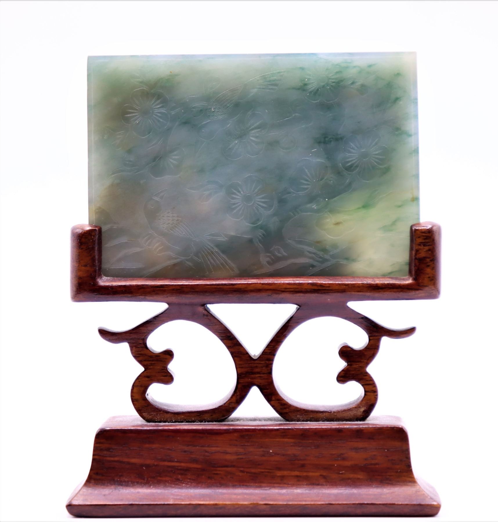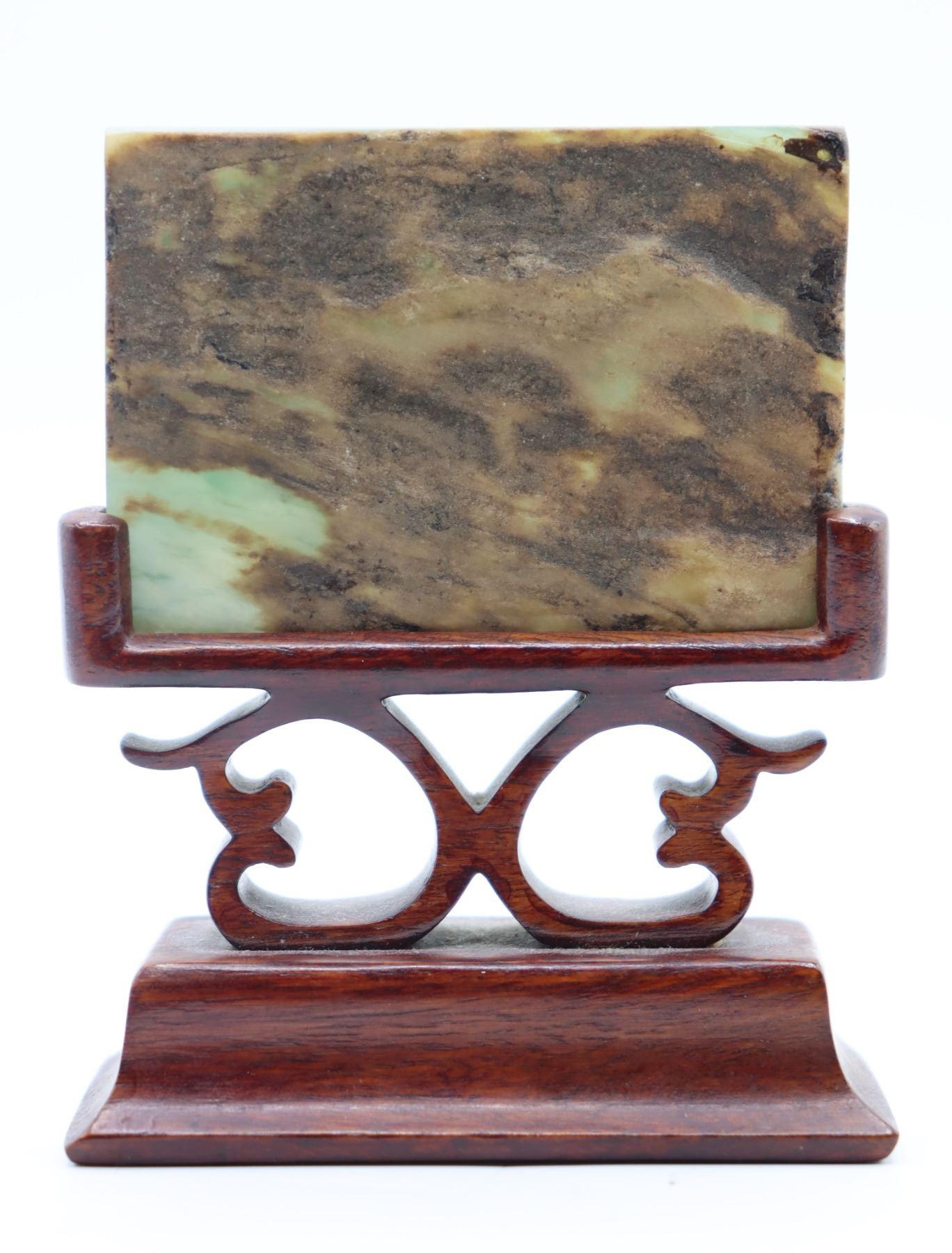 20th C Chinese Jade plaque, rectangular jade plaque with variations through out, held by a carved wood stand.