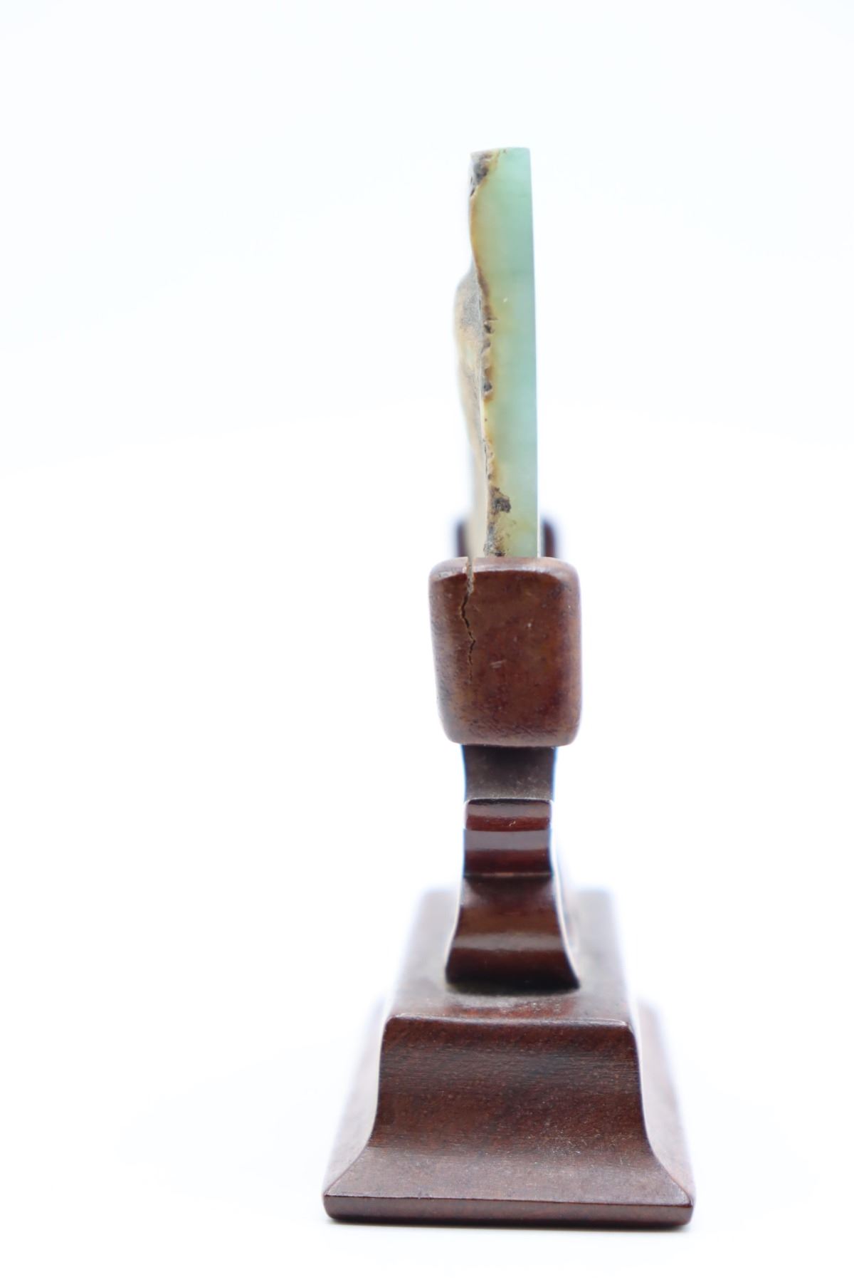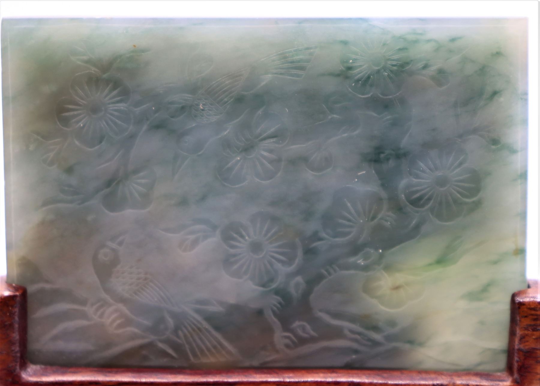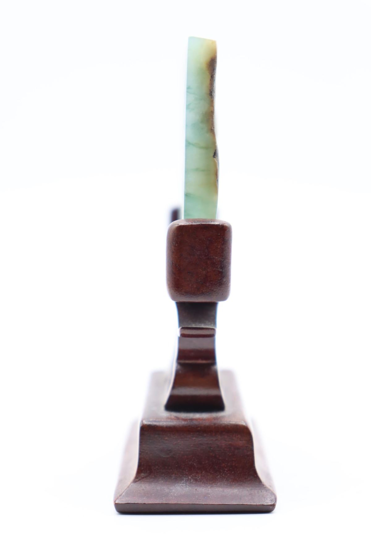 20th C Chinese Jade plaque, rectangular jade plaque with variations through out, held by a carved wood stand.