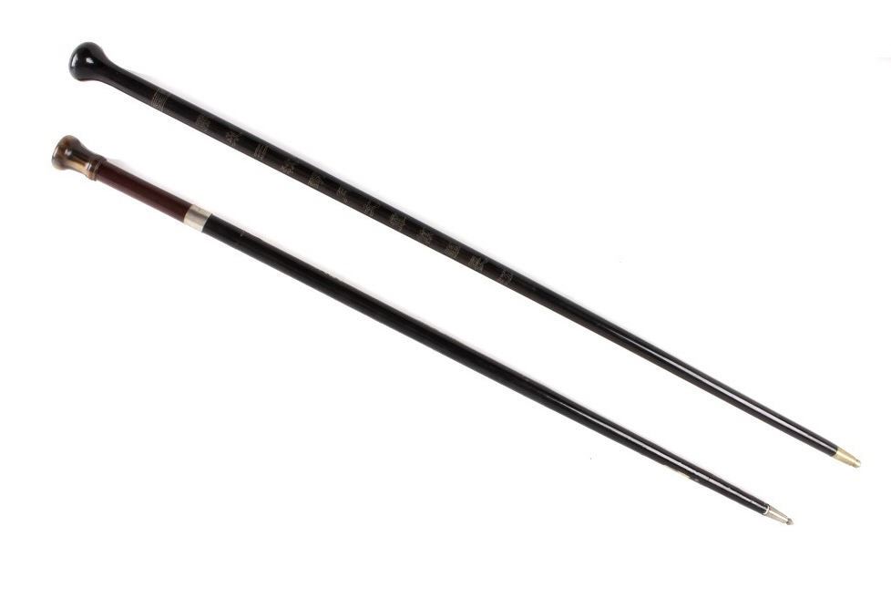 For your consideration are these canes—a 20th C. Chinese turned wood cane with a bone knob handle and a composite knob cane with a spike tip. The first cane shows turned wooden construction with two separate paint jobs, a composite knob, and a circular piece of bone inlaid into the head. The second cane shows a solid composite design with a stainless steel core and Chinese lettering adoring the cane vertically. The condition of these canes is good, with small wear to the turned wood cane and some markings to the paint on the wooden cane. The other composite cane is in good display condition. The measurements of these canes are 35 3/4" x 1 1/2" in diameter and 36" x 1 1/2" in diameter.