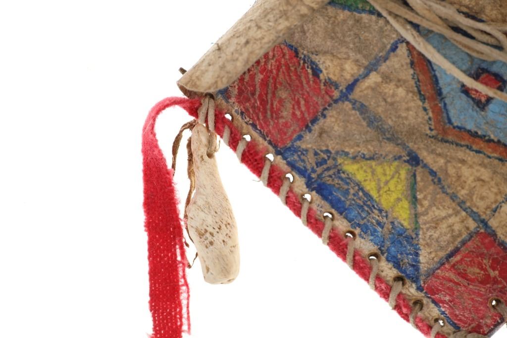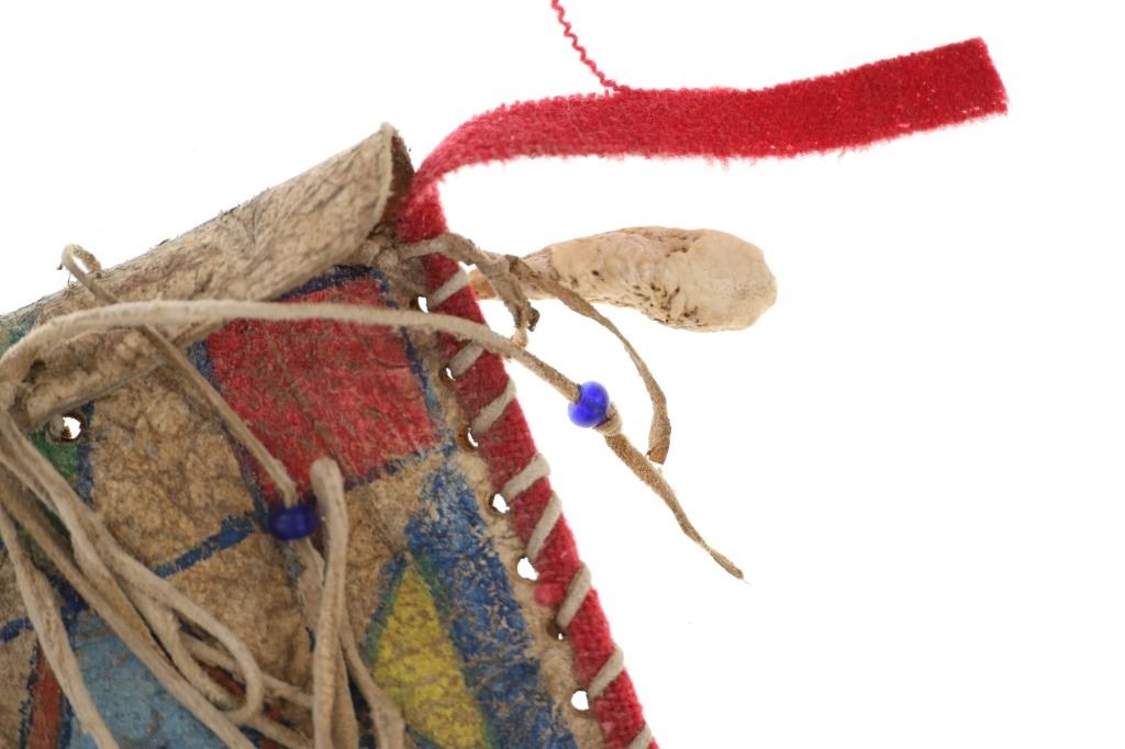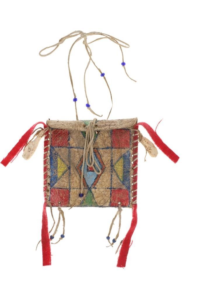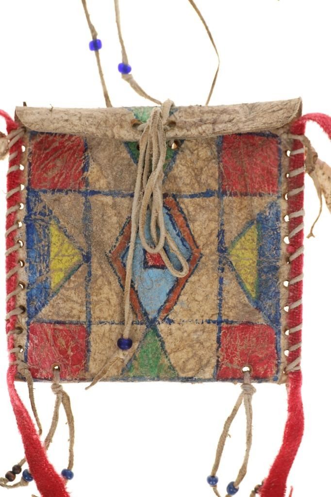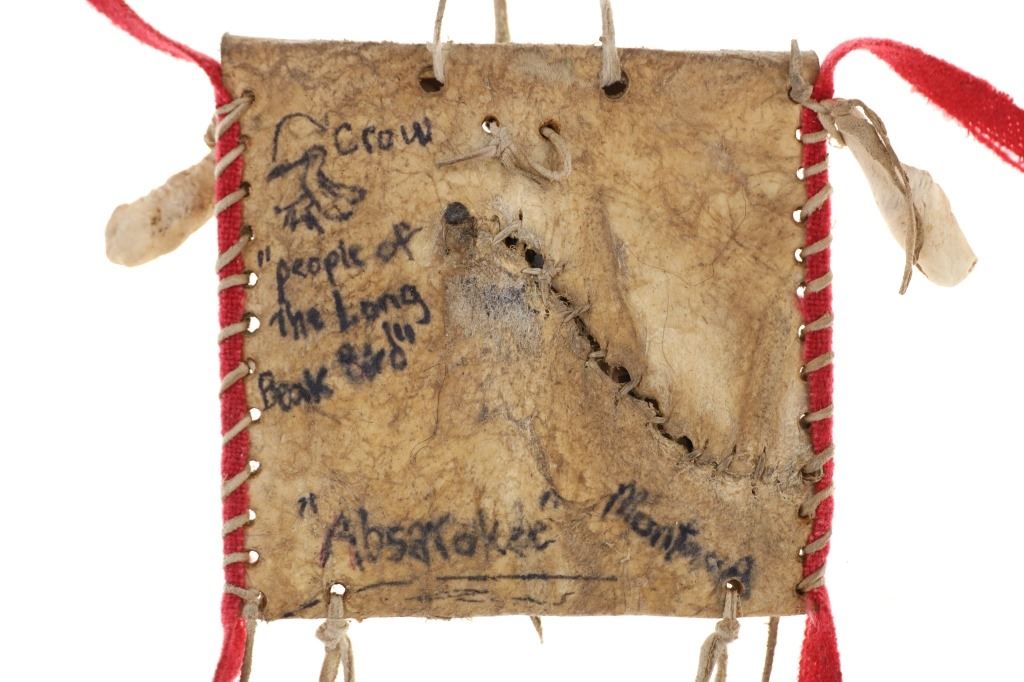 The lot features a polychrome painted parfleche envelope from the Crow Apsáalooke of Absarokee, Montana from the 20th-century. The Apsaalooke bag is accompanied by several collection tags which read as such, “Crow Ca. 1880’s Buffalo Rawhide with all clay / hide glue paint – Age / hide spun paintna”, “Burned holes. Brain tan deer hide thongs. London square weave 100% wool trim.”, “The Crow Call Themselves – ‘The People of the Long Beak Bird’ Montana Home”, “A Crow is long beak the word ‘Absaroke’ is crow in Crow. Also a Mt. Range, a town, a river.”, “Contents – fall / August Montana Silver sage – to Seed – plant?”, “Bull Buffalo Beard Hair – a Montana Herd.”, and "Two very old -vv- worn Buff Bull Teeth from at least an 25-30 year old" on one side and "Beads - Glass Blue Italy 1890-1900 copper-France 1890 / Age patina & sizing". The back exhibits thick buffalo / bison hide parfleche rawhide with Indian hide sewing and covered in classic geometric polychrome painting in blue, yellow, red, orange, green and light blue. The bag has strips of old red stroud trade clothe on the sides, two worn old Buffalo / Bison bull teeth as well as various old trade beds on the Indian hide fringes. The back is signed / painted on, "Crow 'the people of The Long Beak Bird' / 'Absarokee' Montana" with a painting of a Crow bird. The back has a seem sewn with sinew. Measures with fringes and strap 15.5-inches long, bag itself without fringes, clothe, and strap is 6-inches by 5.5-inches.