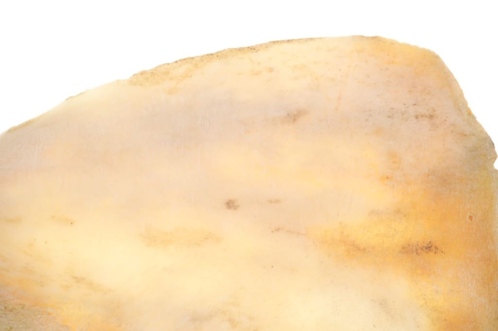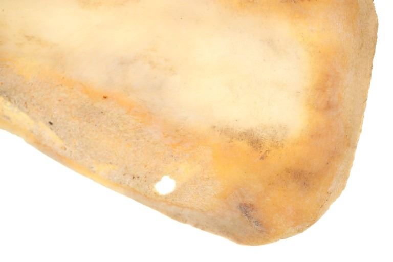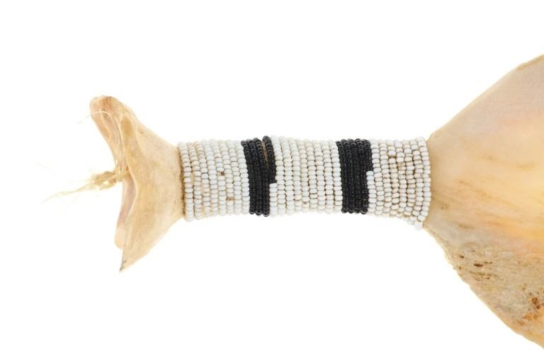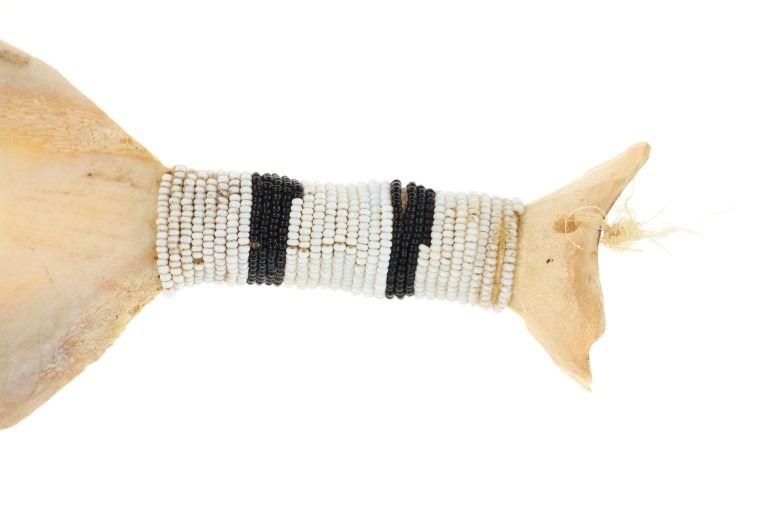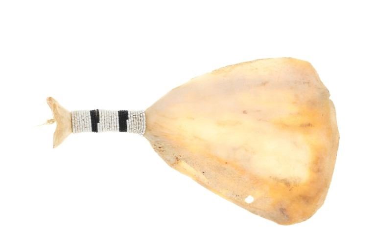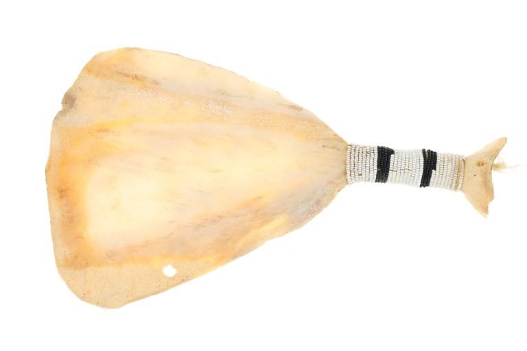 The lot features a buffalo / bison scapula bone with beadwork from the Crow Apsáalooke of Montana with an older age from the 20th-century. The piece shows a carved bison scapula bone with the handle covered in glass trade pony and seed beads of black and chalk white having a carved bone end and carved flattened fan area. The bottom has sinew fringe ties. The piece is well kept and little bead loss. Measures 13-inches long by 7.5-inches wide.