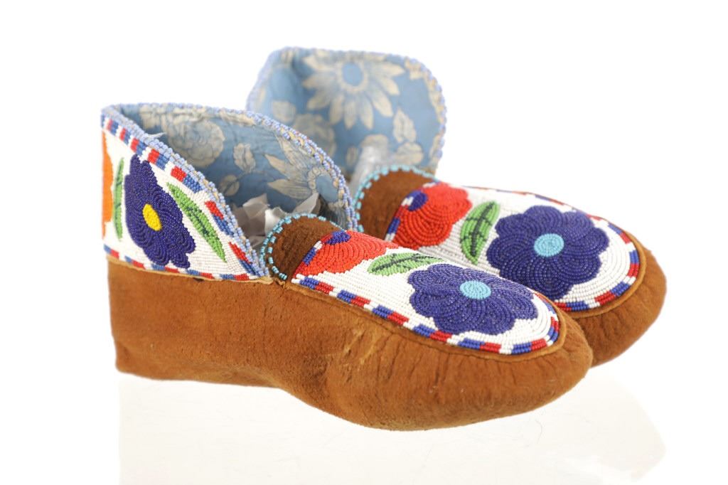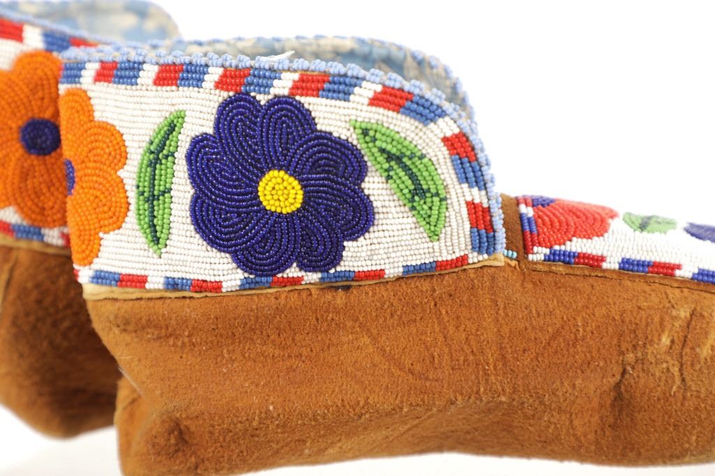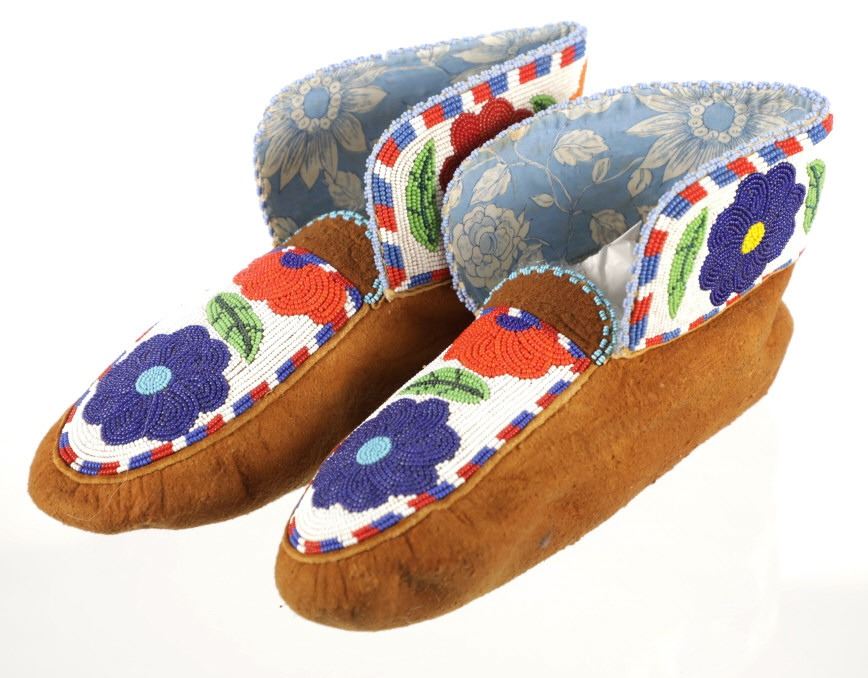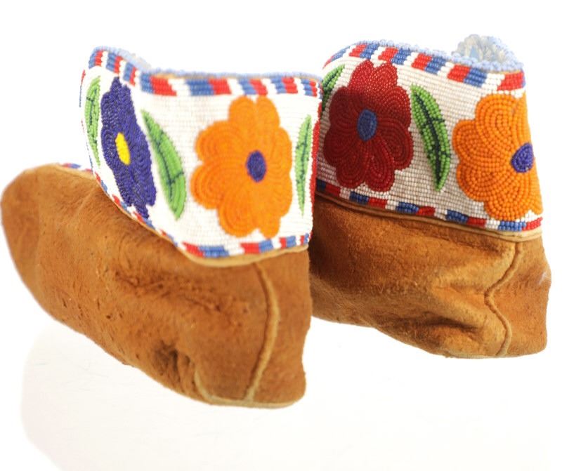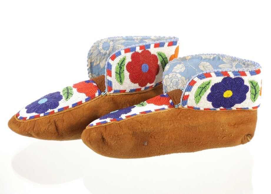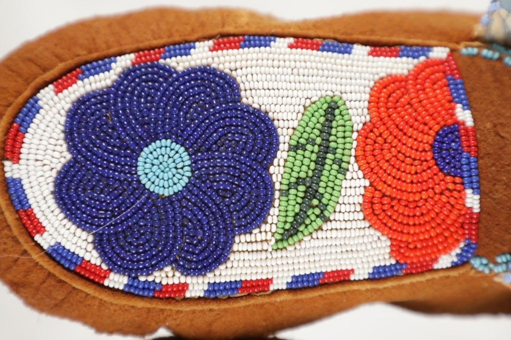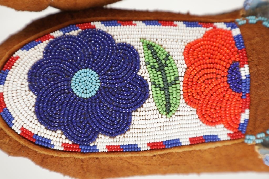 This is a wonderful set of large, men's beaded moose hide moccasins from the Metis Cree of the Canada. The set shows Indian brain-smoked tanned thick Moose hide with calico floral trade clothe, covered foot geometric and floral beadwork and medium height beaded ankle. The beadwork shows nice pony and trade seed glass beads in a geometric and floral pattern, in classic Metis Cree pattern. The set displays beautifully and is from the mid-to-late 20th Century. Provenance: From the Dan Paynich Great Falls, Montana collection. Each measures 11.5"L sole by 5 1/8"W by 5"H ankle. Total weight of 12 oz.